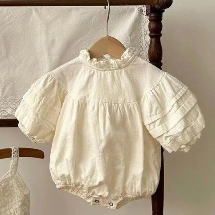 Crafted from soft and breathable cotton fabric, this bodysuit ensures maximum comfort for your toddler. The puff sleeves provide a trendy look, while the solid color adds simplicity and versatility to the outfit.