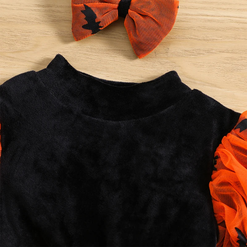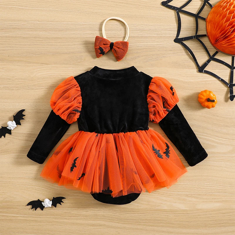 Dress your little princess in adorable Halloween style with our Autumn Halloween Infant Baby Girls Outfits. This charming ensemble features a long puff sleeve print bodysuit dress adorned with festive Halloween motifs, complete with a matching headband.
