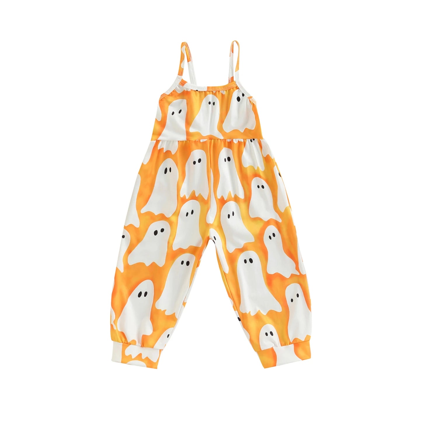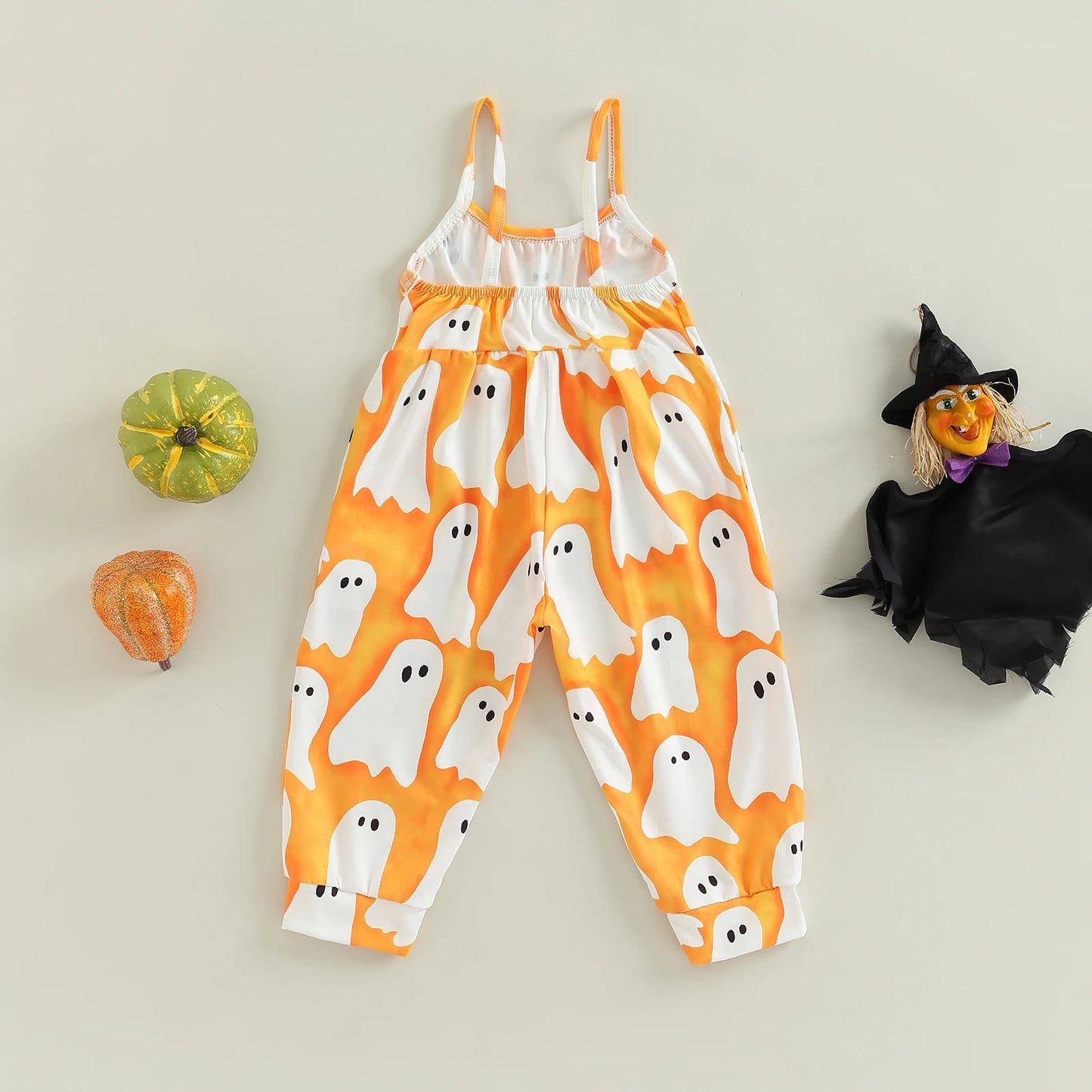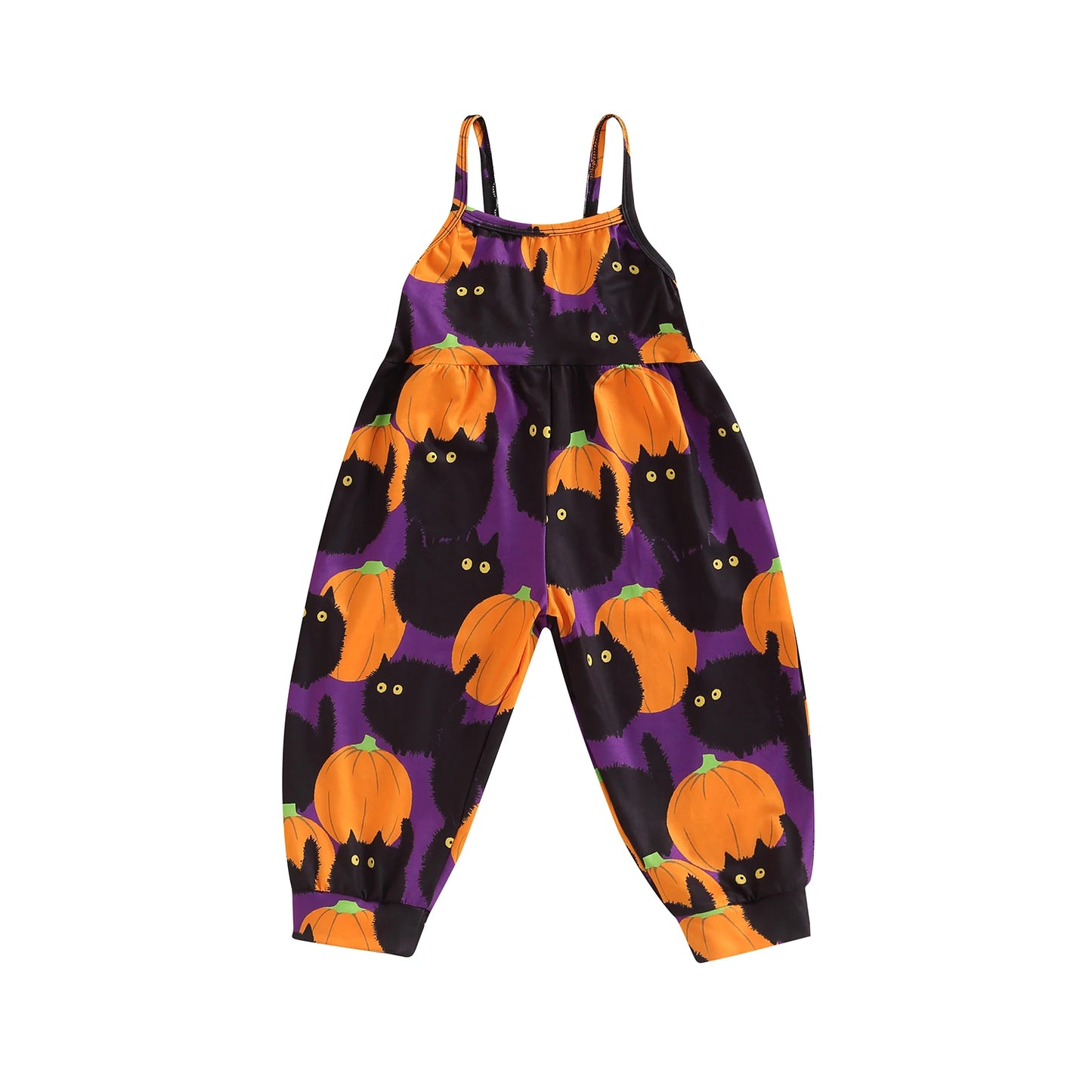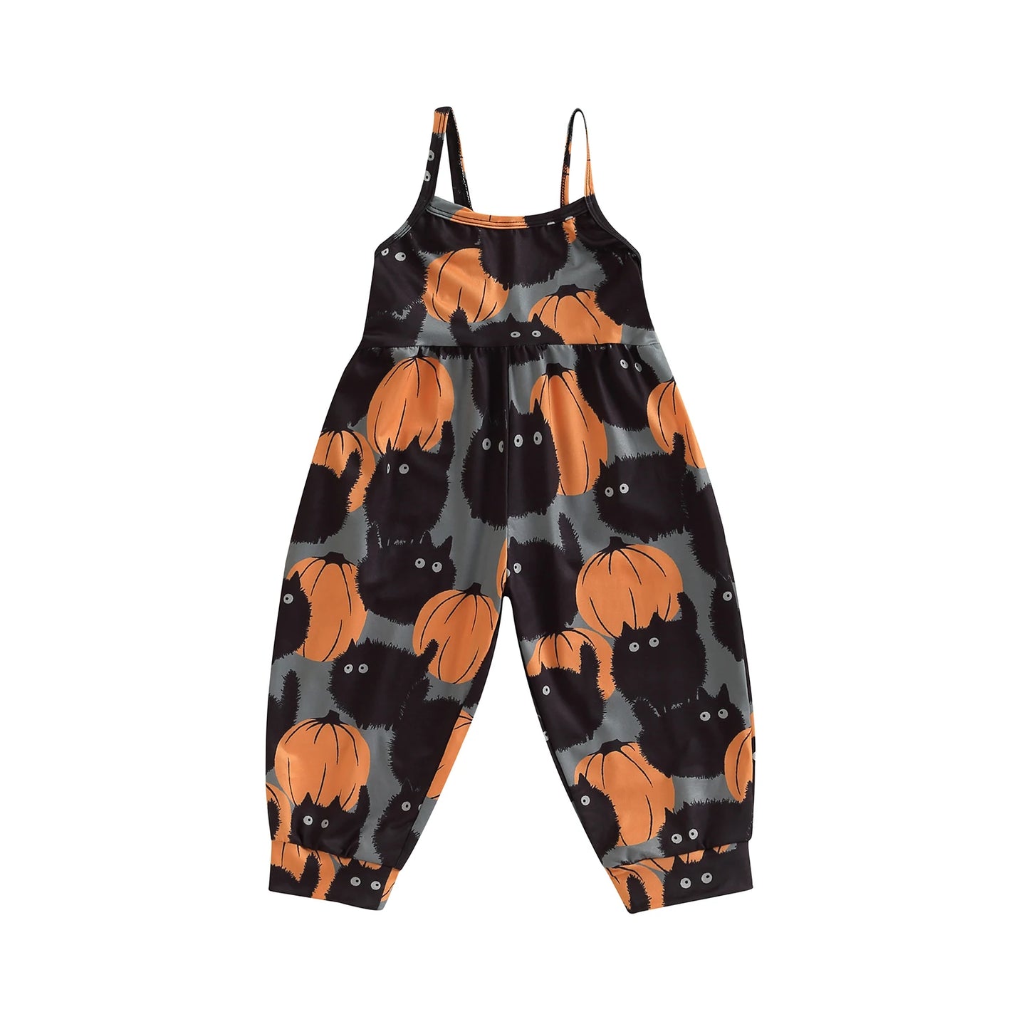 Dress your little girl in adorable Halloween style with our Toddler Kids Girls Halloween Romper. This charming jumpsuit features a choice of playful prints including ghosts, cartoon cats, and pumpkins, making it perfect for adding a festive touch to your toddler's wardrobe during the spooky season.