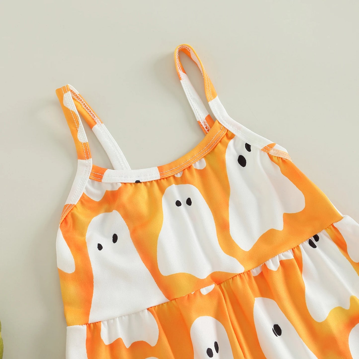 Crafted from soft and comfortable fabric, this romper ensures your little one stays cozy and stylish during Halloween festivities. The sleeveless design with sling straps allows for easy movement and comfortable wear, while the cute prints add a fun and whimsical vibe to the outfit.