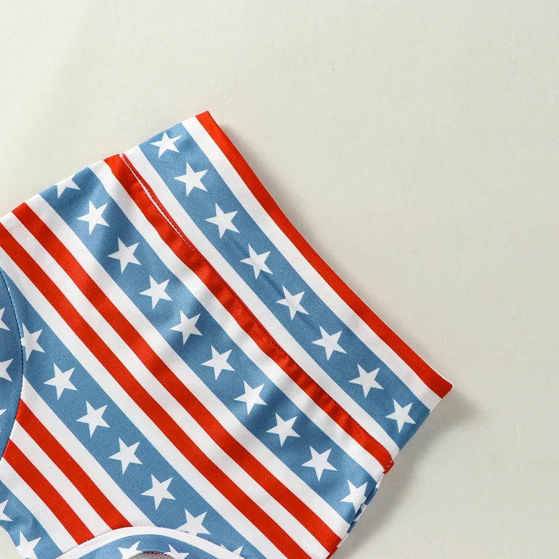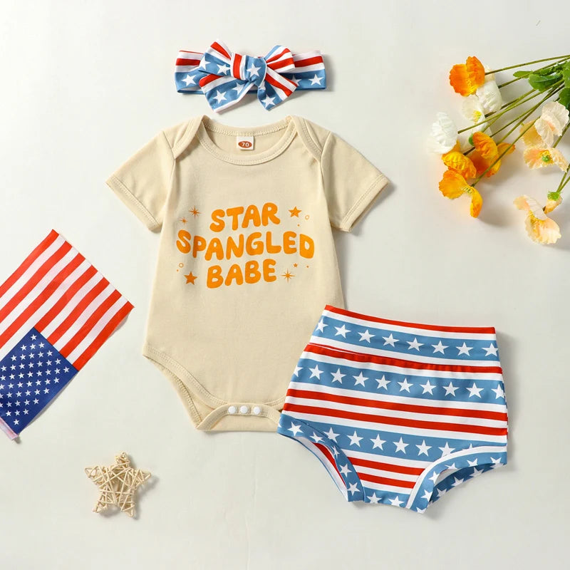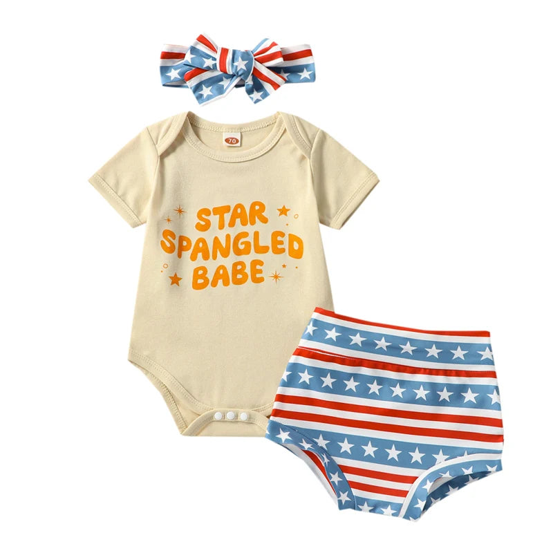 Celebrate in style with our adorable Independence Day Baby Girls Letter Print Short Sleeve Jumpsuit Set. Perfect for little patriots aged 0 to 18 months, this outfit is designed to showcase your baby's American spirit. The short sleeve jumpsuit features charming letter prints, adding a festive touch to your little one's ensemble. Paired with star and stripe shorts, along with a matching headband, this 3-piece set is both patriotic and cute.