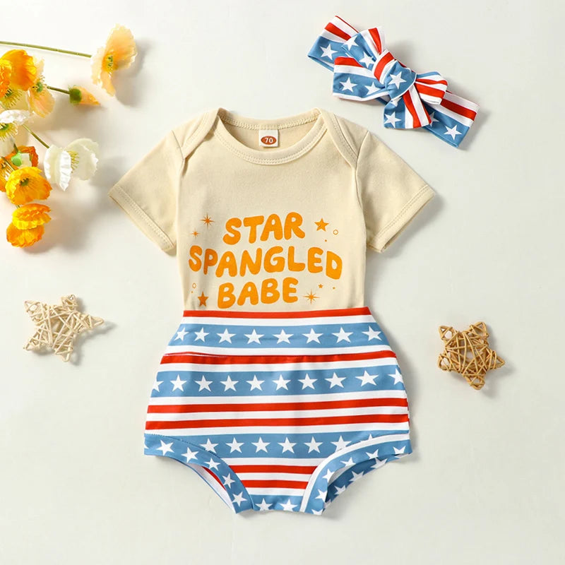 Independence Day Baby Girls Short Sleeve Jumpsuit with Star Stripe Shorts and Headband
