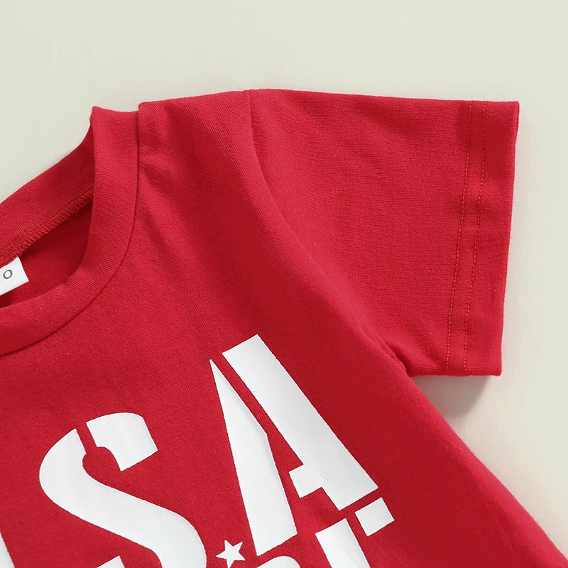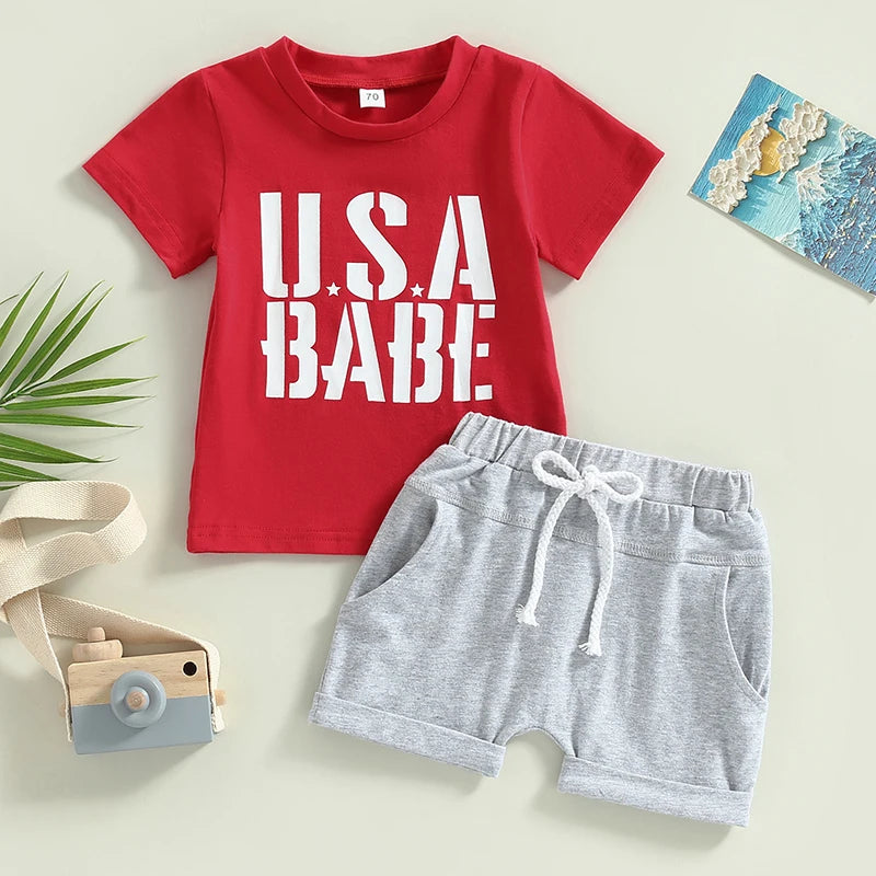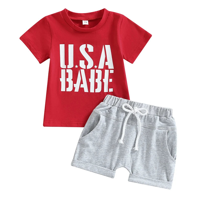 Dress your little ones in style for Independence Day festivities with our 2-piece outfit set. This ensemble includes short sleeve tops and drawstring solid color shorts, perfect for celebrating the holiday in comfort and style.