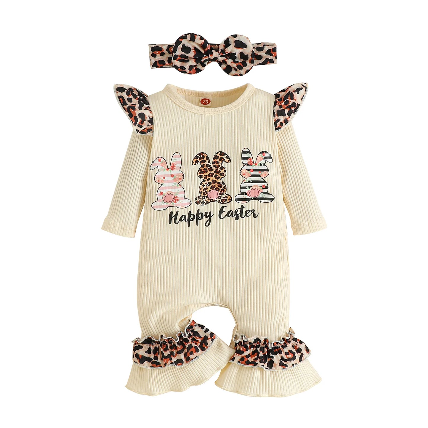 Infant Baby Girl Easter Day Clothing Romper - Long Sleeve Letter and Rabbit Printed Jumpsuit With Bow