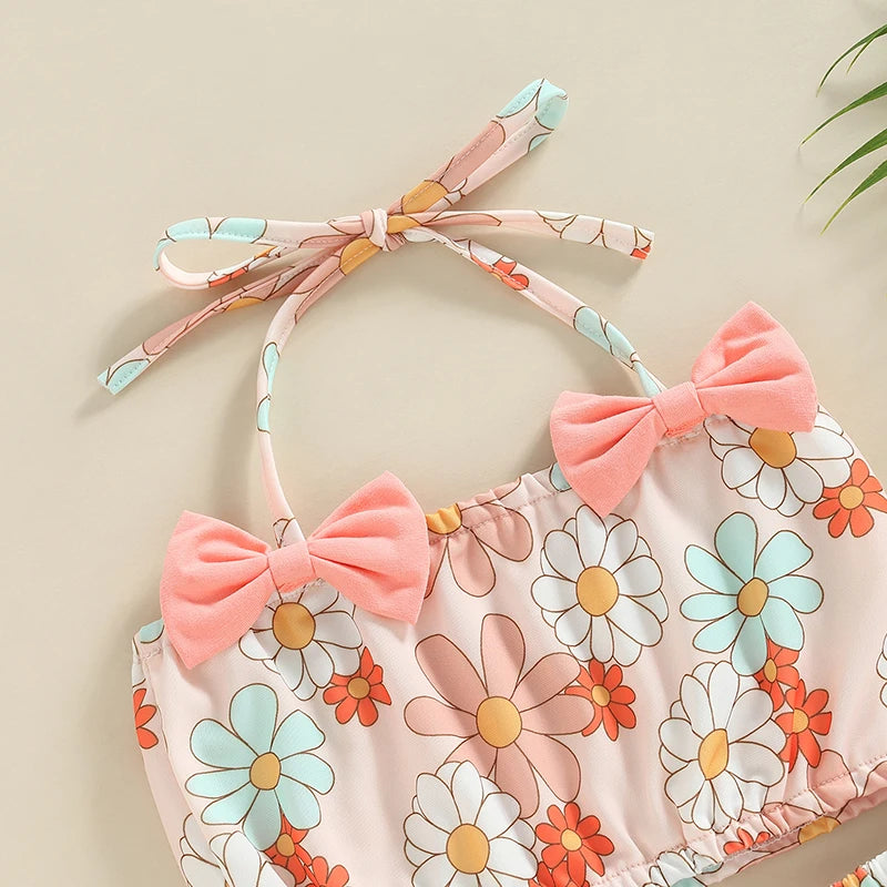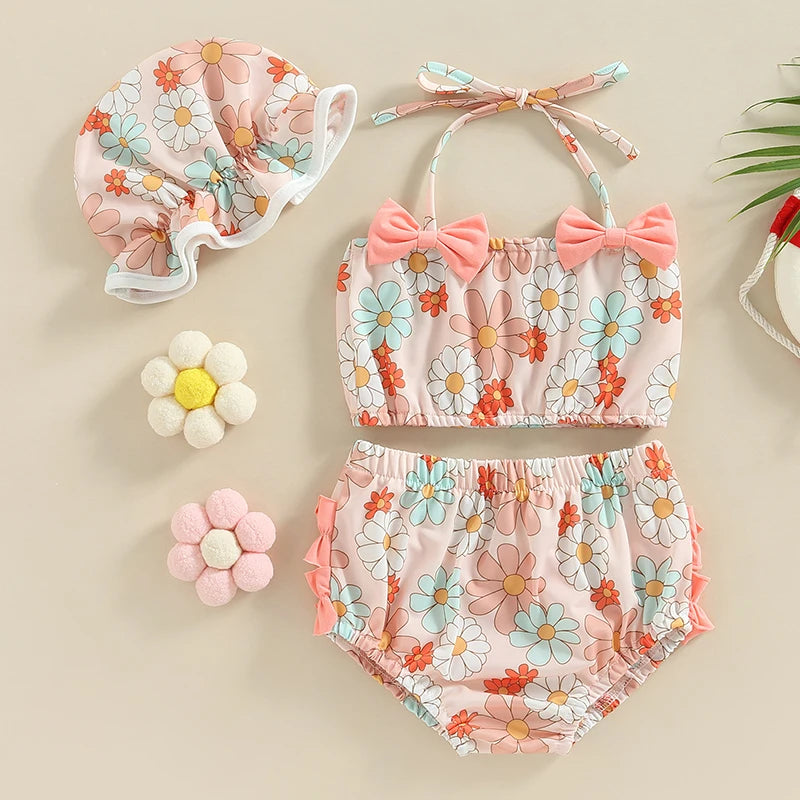 Dress your little princess in style with this adorable infant baby girls' 3-piece swimsuit set! This set includes a charming halter bikini adorned with a floral print, along with a matching swim cap to complete her beach-ready look. Perfect for pool parties or beach days, this bathing suit set is sure to make a splash wherever she goes.