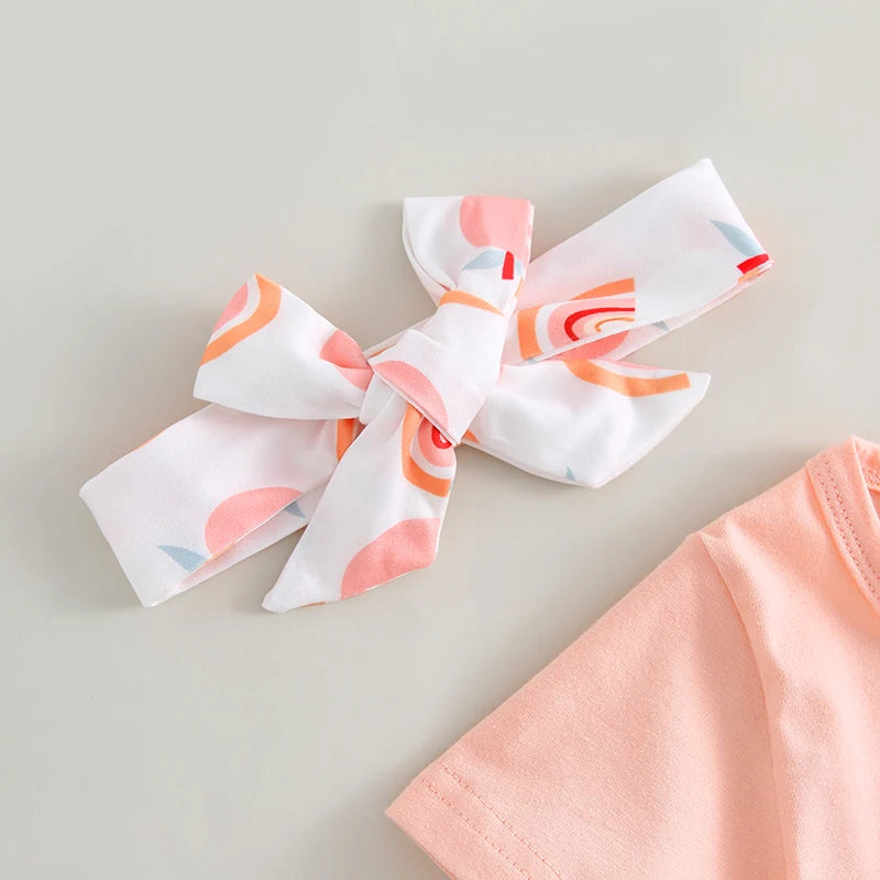 Crafted from soft and comfortable fabrics, the short sleeve t-shirt adds a playful touch with its letters print design. The peach print flare pants offer a charming and fashionable look for your little one, while the coordinating headband completes the outfit with flair.