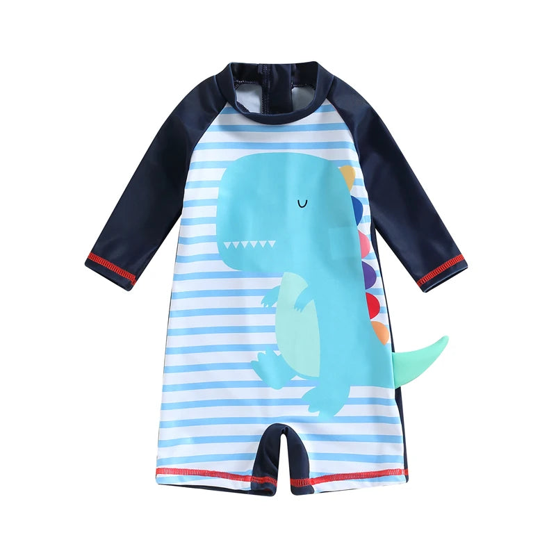 Get your little one ready for a day of beach fun with this adorable kid romper swimsuit! Featuring a playful dinosaur stripes print, 3/4 sleeves, and a round neck, this swimsuit is perfect for summer adventures. Crafted with comfort in mind, it's made from lightweight and breathable materials, ensuring your child stays cool and comfortable all day long.