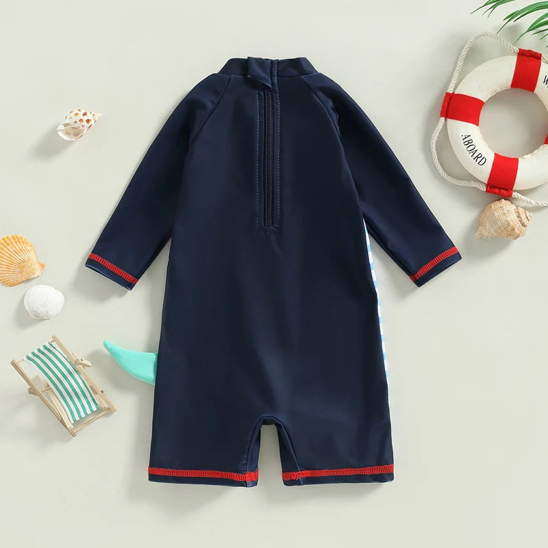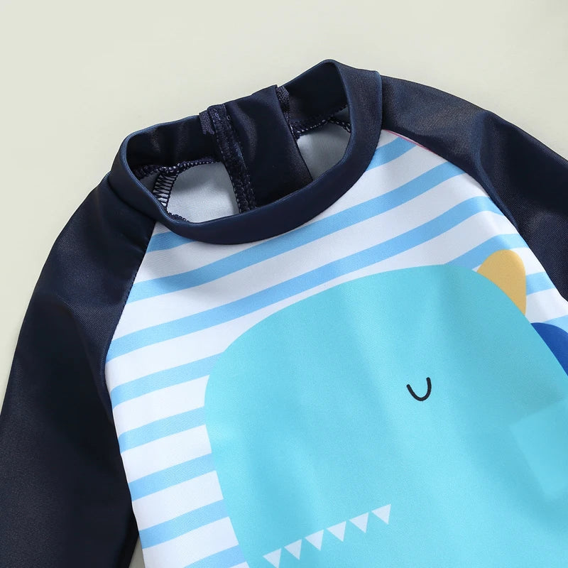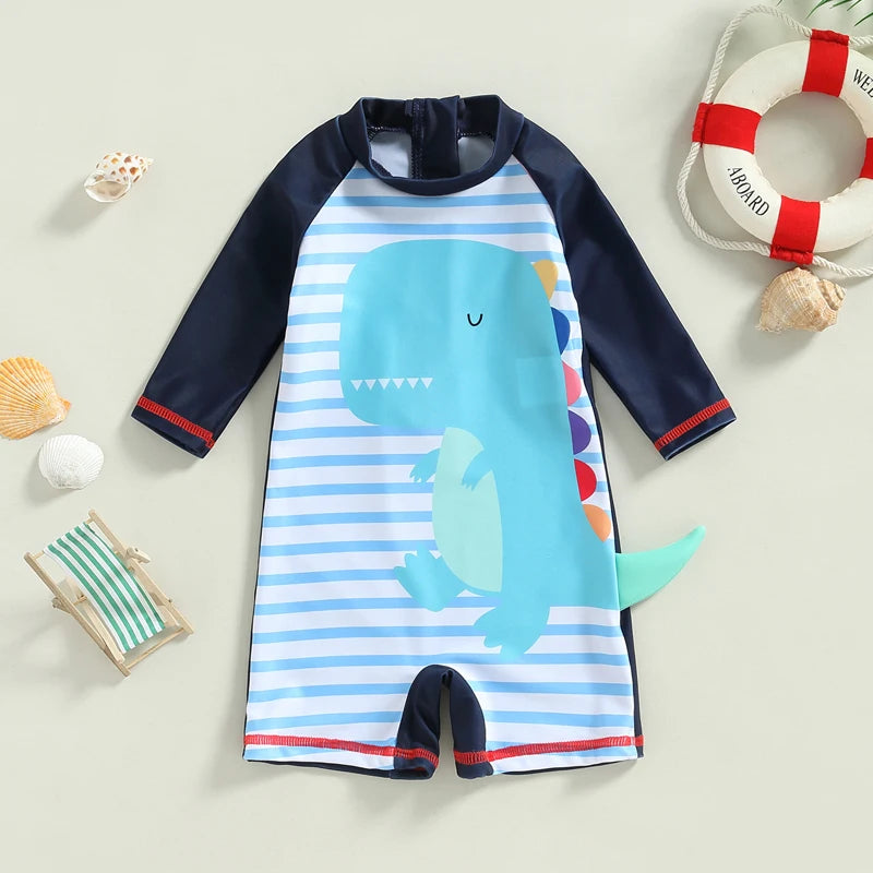 Kid Romper Swimsuit with Dinosaur Stripes Print, 3/4 Sleeves, Round Neck