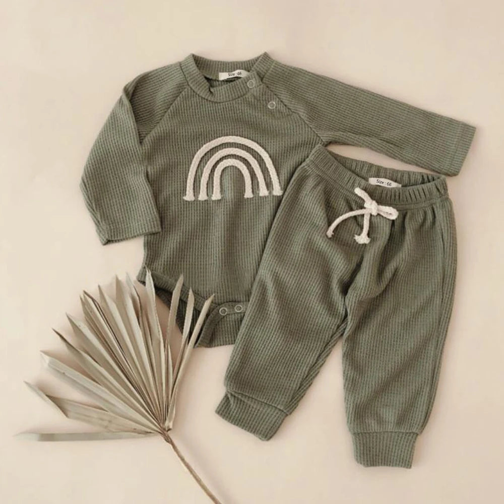 Crafted from soft and breathable fabrics, this clothing set ensures your baby stays comfortable and stylish. The rainbow cotton sweatshirt adds a pop of color and warmth, while the pants offer ease of movement for active toddlers.