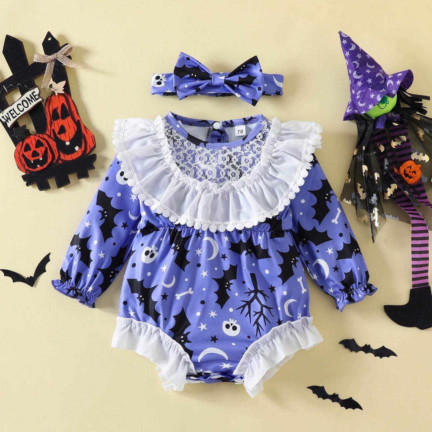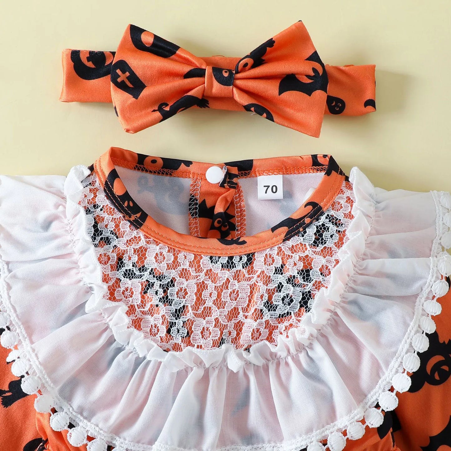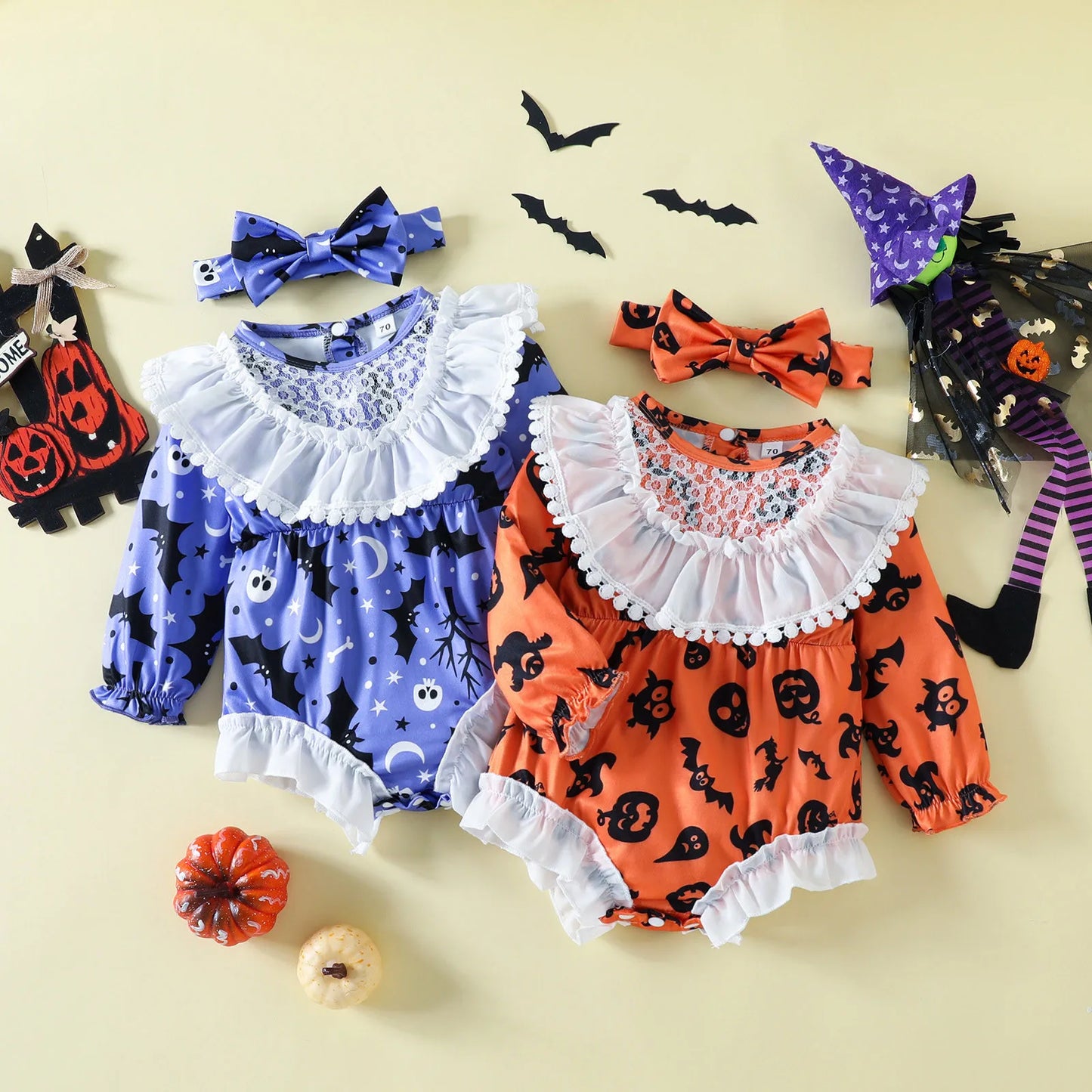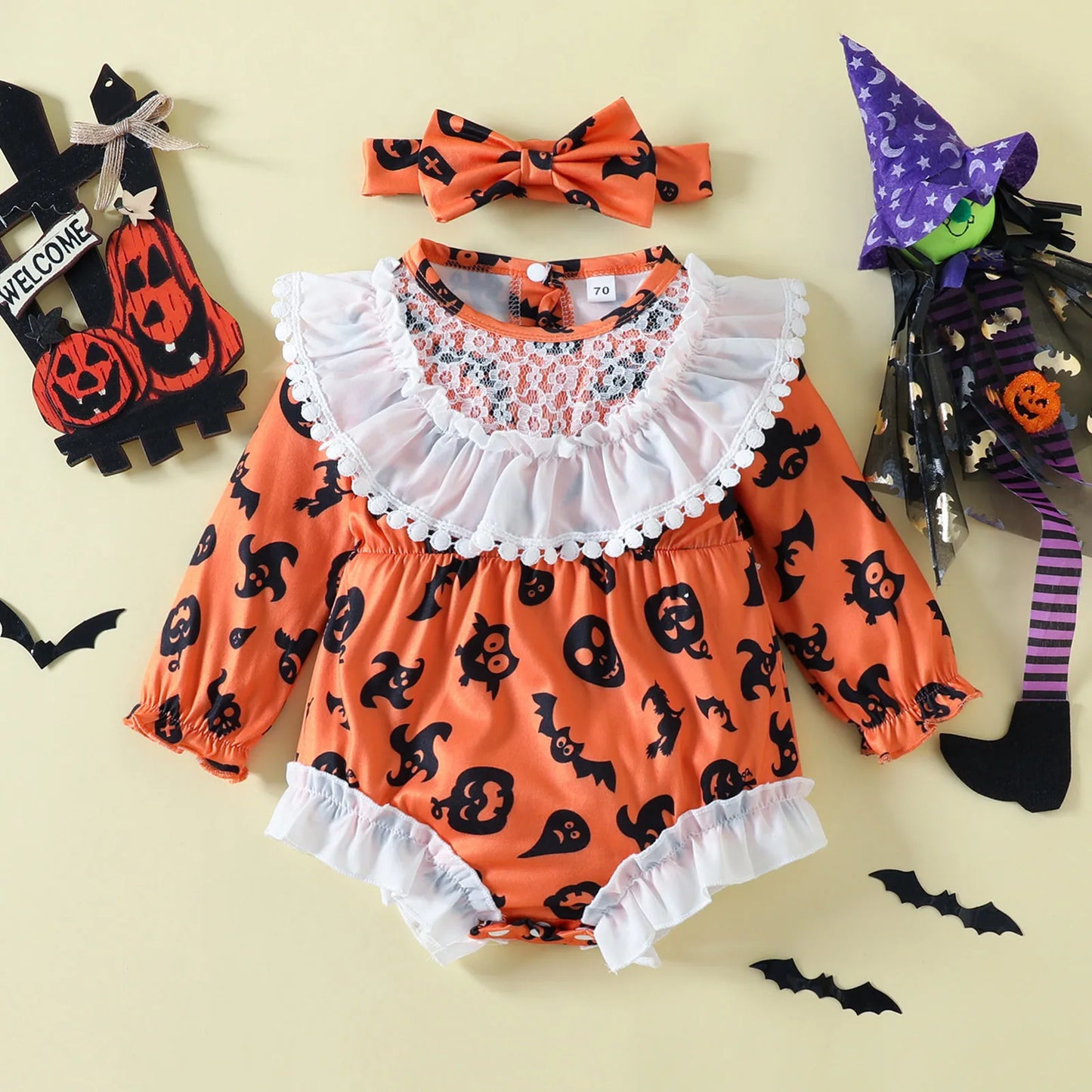 Long Sleeve Halloween Cartoon Prints Lace Romper - Newborn Bodysuits with Headbands