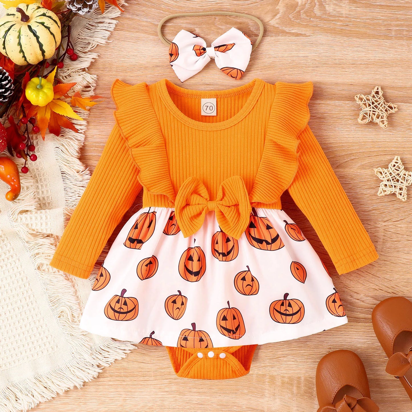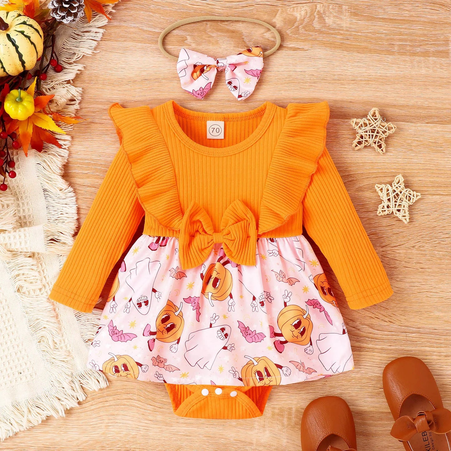 Long Sleeve Halloween Cartoon Prints Romper - Newborn Bodysuits Dress Headbands Outfits