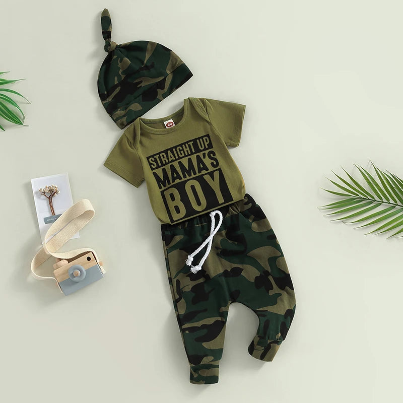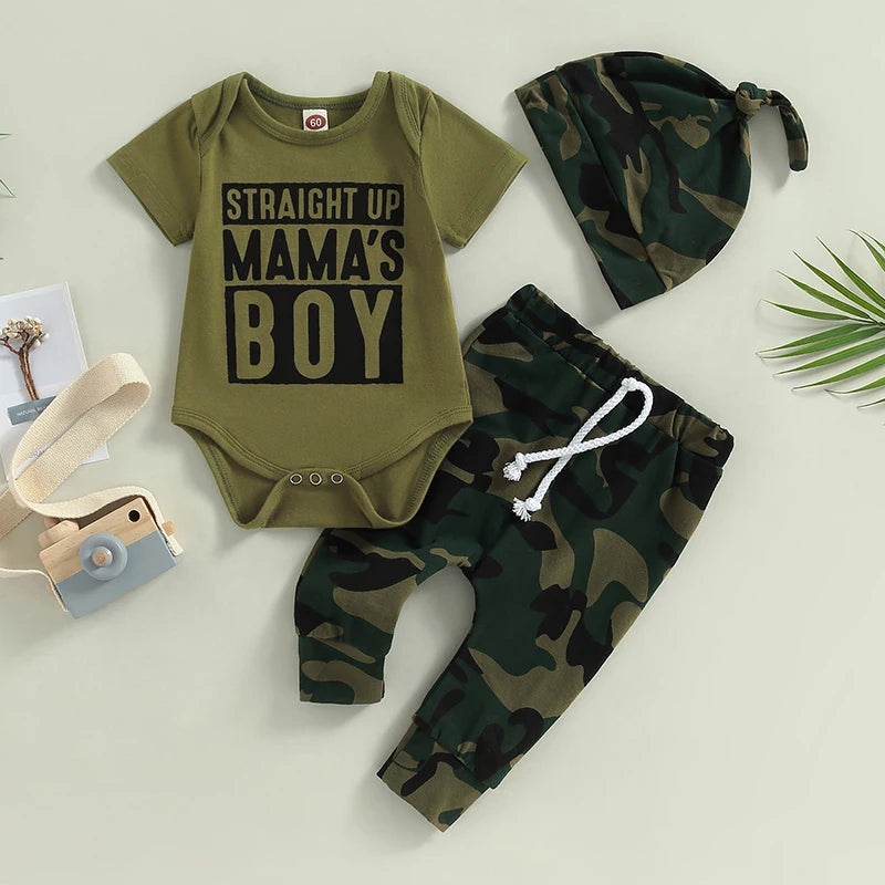 Newborn Baby Boy 3-Piece Spring Outfits Short Sleeve "Mama" Letter Romper, Pants, Knot Hat Set
