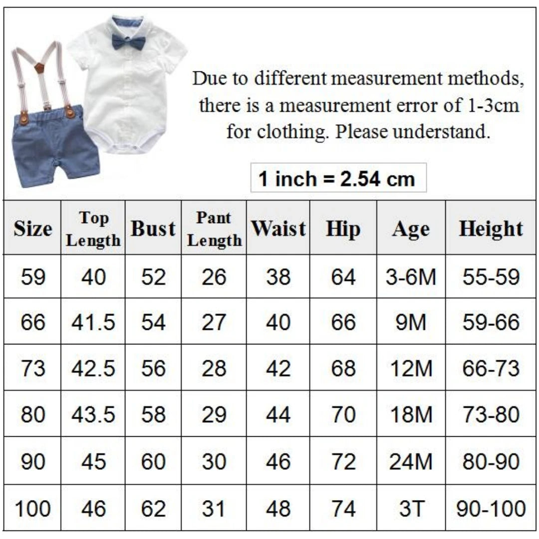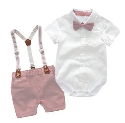 Crafted from soft cotton fabric, the romper features a classic design with a stylish bow detail, adding a touch of sophistication to your baby boy's look. The included suspender pants complete the ensemble, creating a polished and dapper outfit for your little one.
