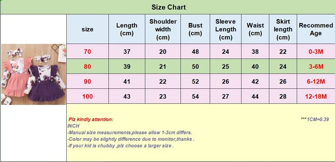 Dress your newborn baby girl in adorable style with our 3PCS Outfit Set. This charming ensemble includes a floral print long sleeve romper top, suspender skirt, and matching headband, creating a cute and coordinated look for your little one.