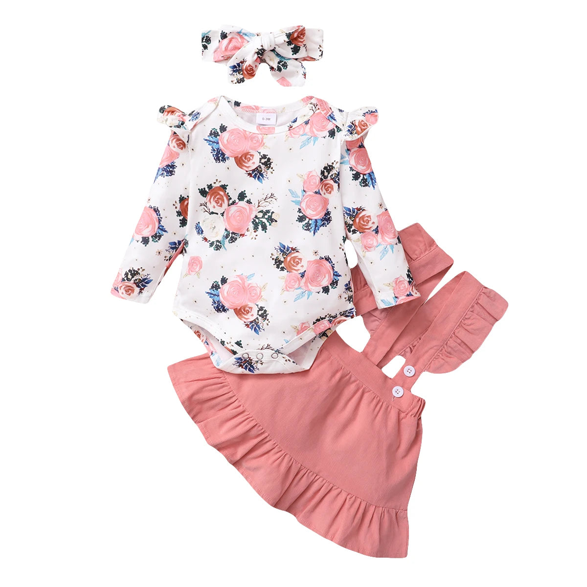 Newborn Baby Girl Floral Print Long Sleeve Romper Top + Suspender Skirt + Headband 3PCS Outfit Set - Cute Ensemble