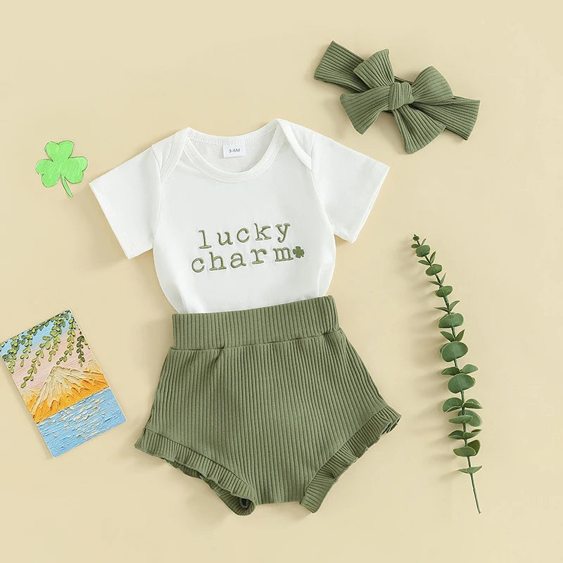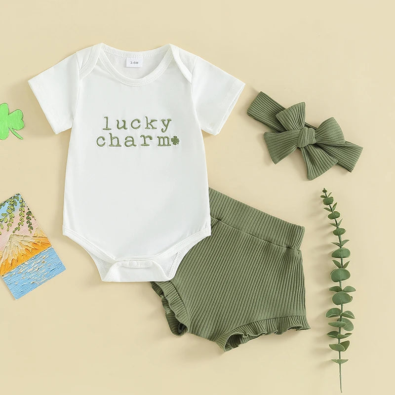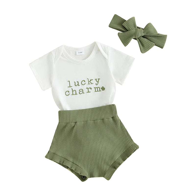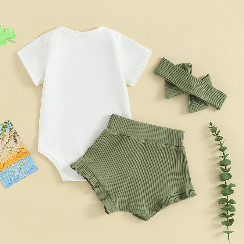 Dress your little princess in festive style with our Newborn Baby Girl St. Patrick's Day Clothes Outfit. This adorable set features a short sleeve romper adorned with a charming four-leaf clover design, paired with coordinating bottoms and a headband, perfect for celebrating the holiday in style.