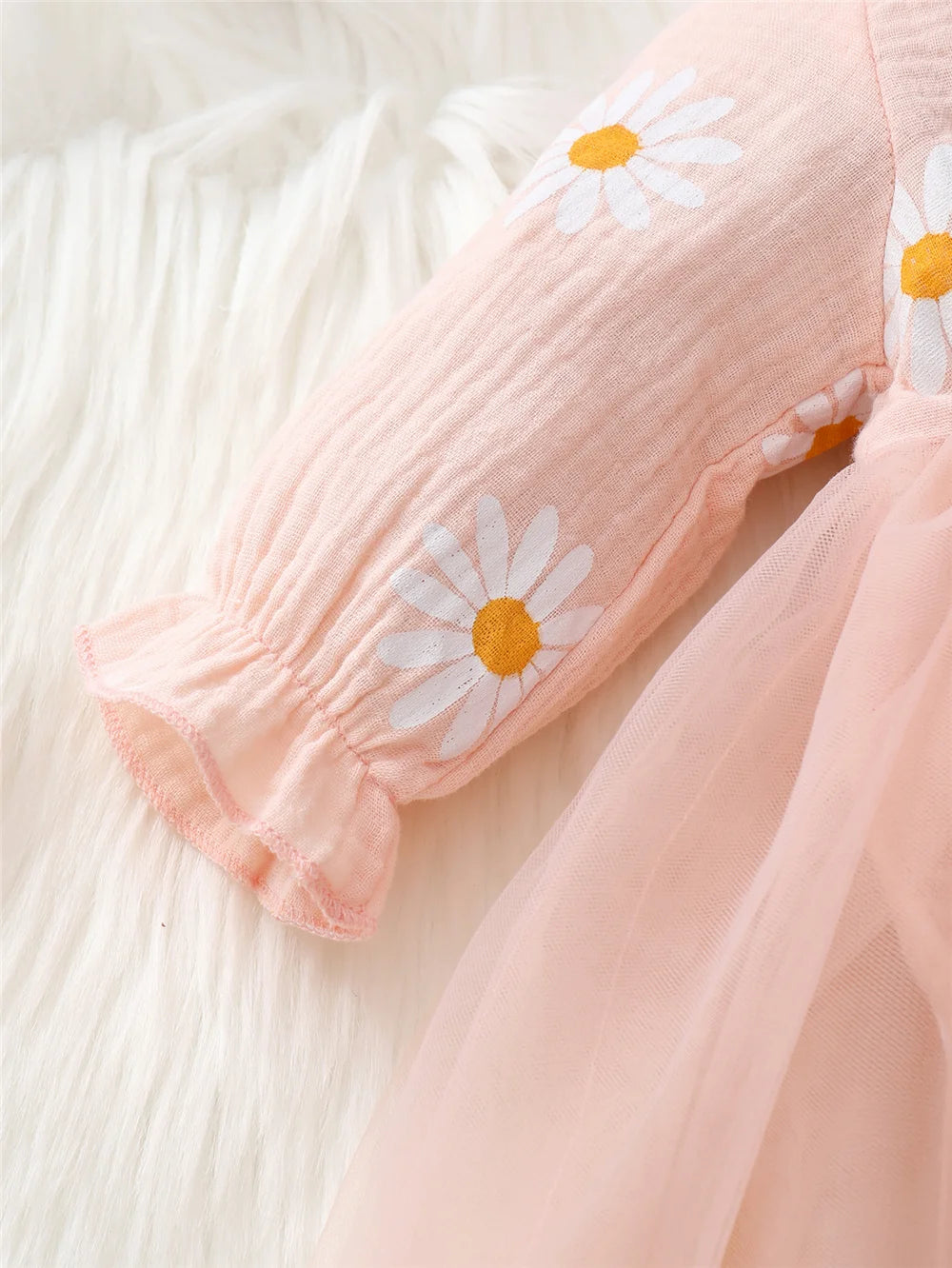 Newborn Baby Girls Pink Princess Dress: Cute Daisy Floral Long Sleeves Tulle Patchwork Bodysuit for Holiday Party