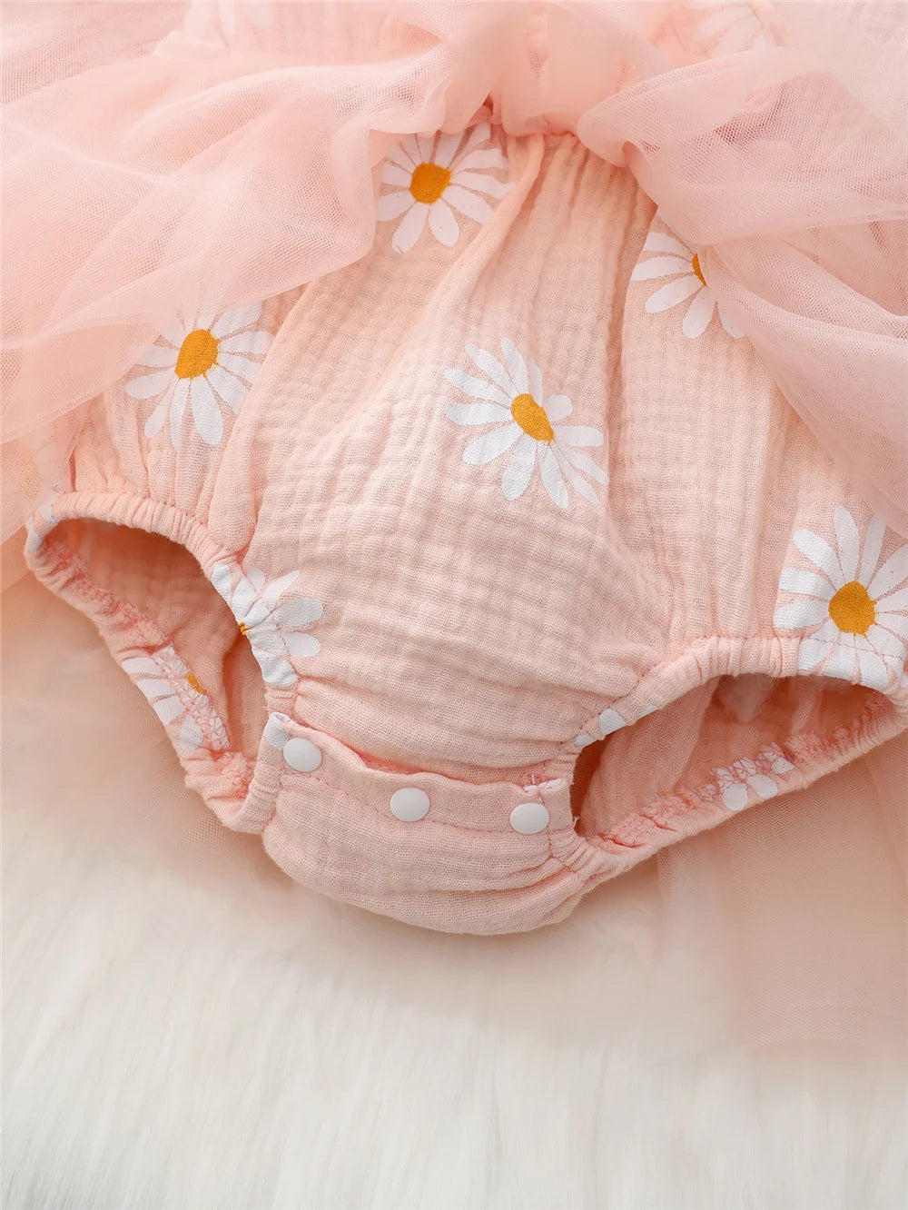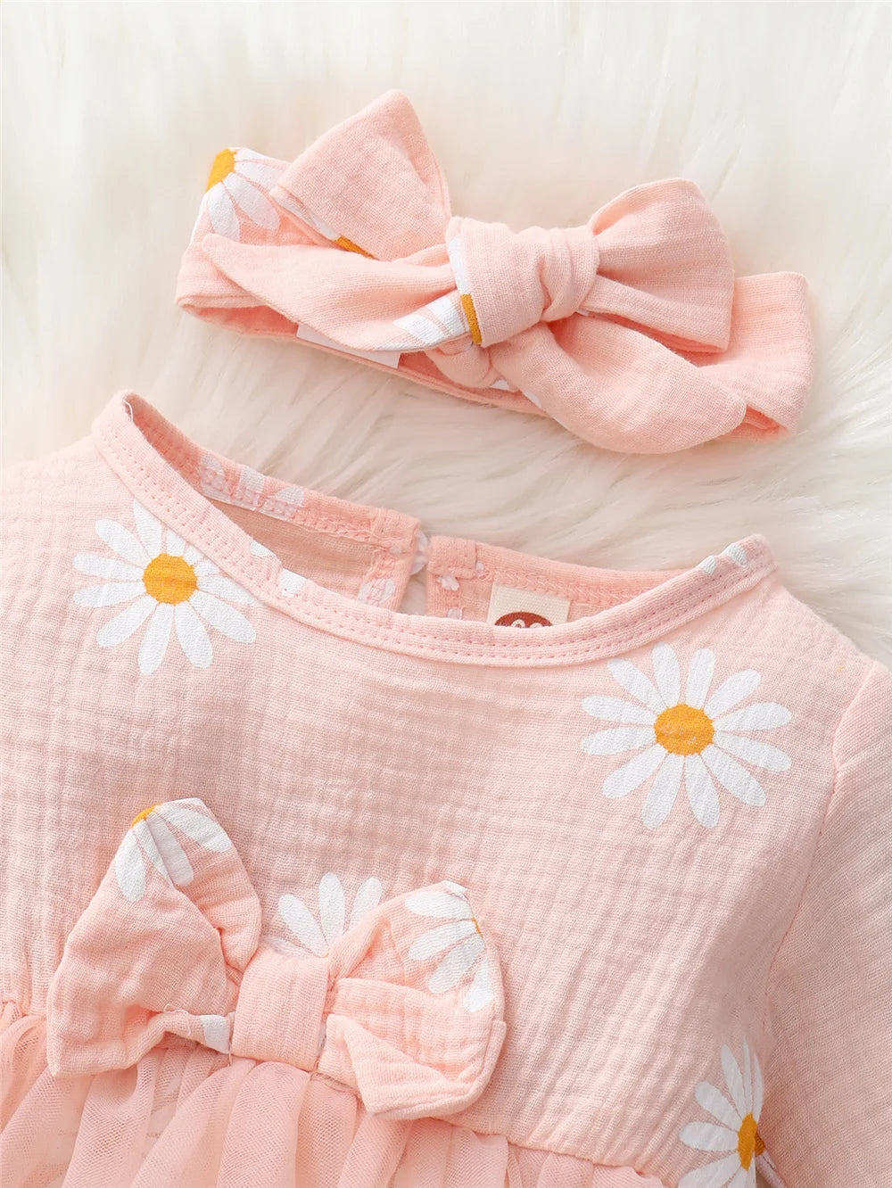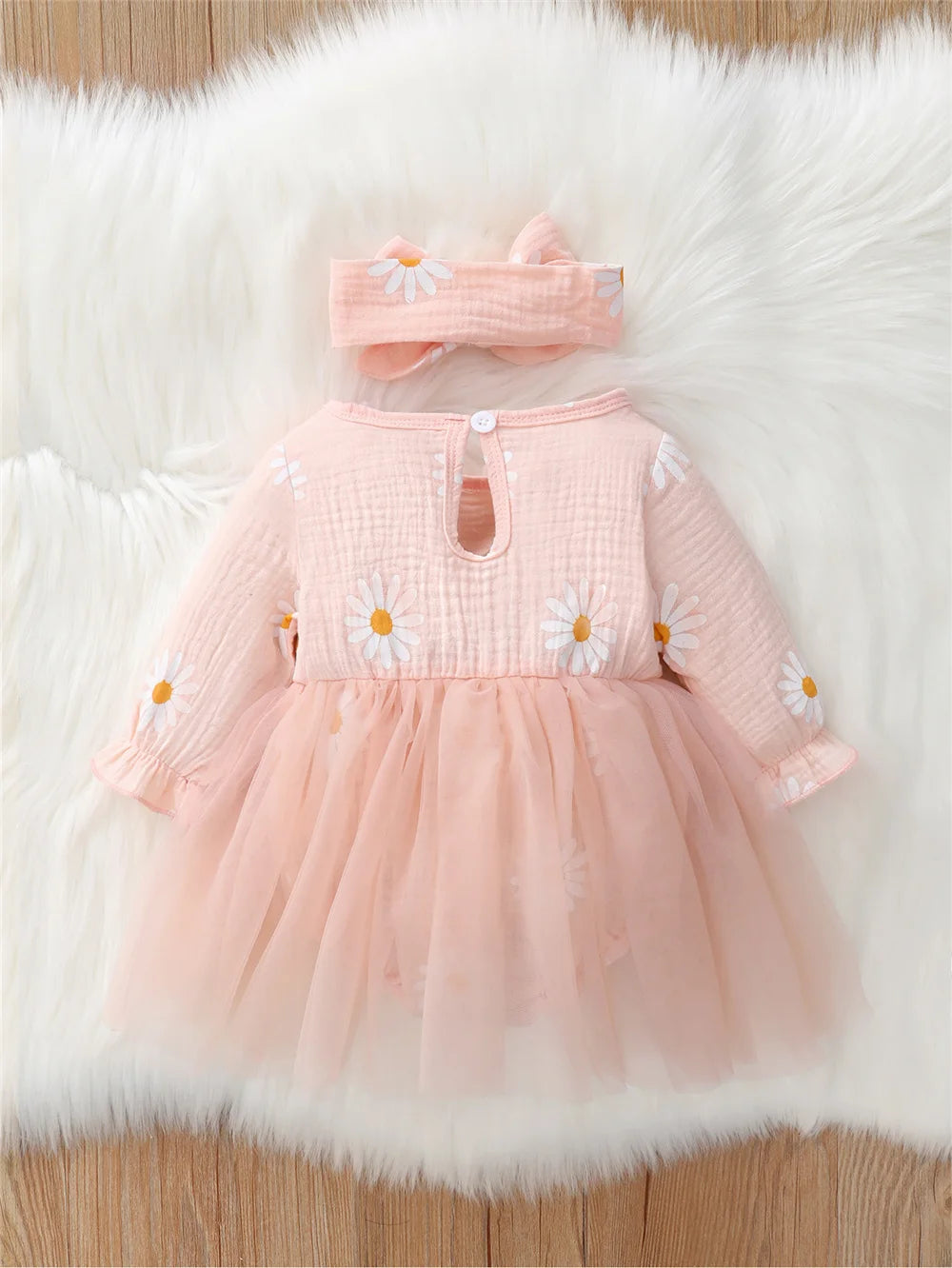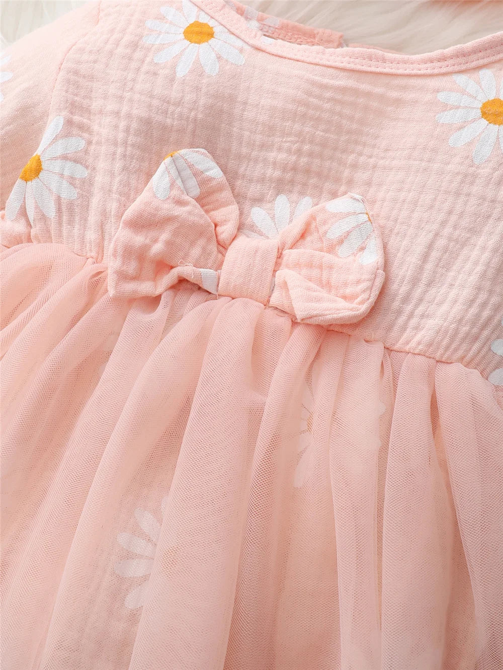 Dress your newborn baby girl like a princess with our Pink Princess Dress. This charming ensemble features a cute daisy floral long sleeves bodysuit with tulle patchwork, perfect for holiday parties and special occasions.