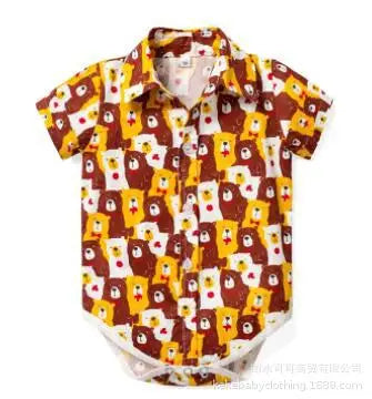 Newborn Boys Cotton Bodysuit with Bow Tie - Cartoon Animal Print Short Sleeve Romper