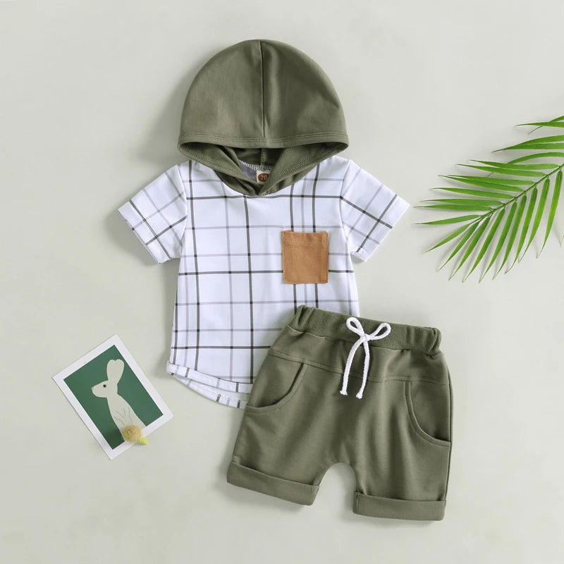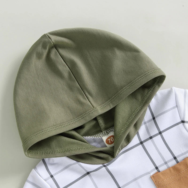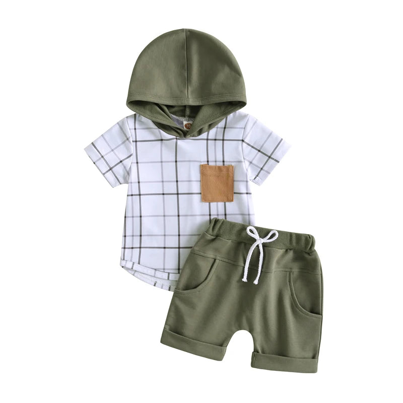 Available in sizes suitable for toddlers aged 0-3 years, our Summer Outfits Set is perfect for any outdoor activity. Whether he's playing in the park or heading to a family picnic, this outfit will keep him looking stylish and feeling great. Treat your little adventurer to the ultimate summer style with our Plaid Print Hoodie and Solid Shorts Set!