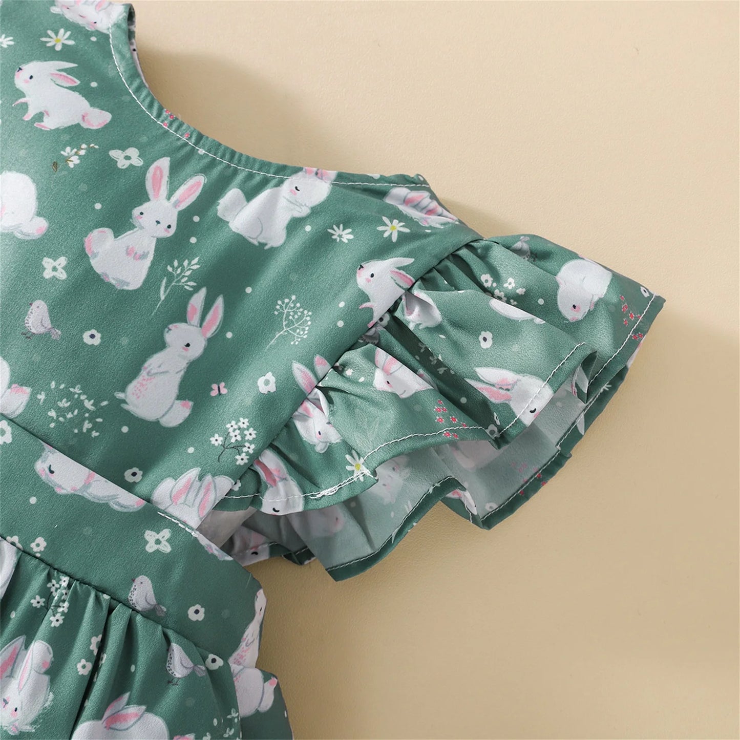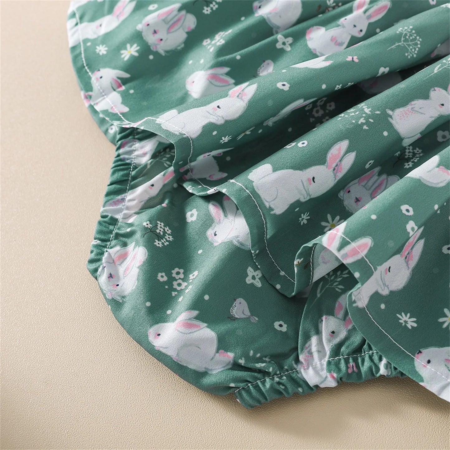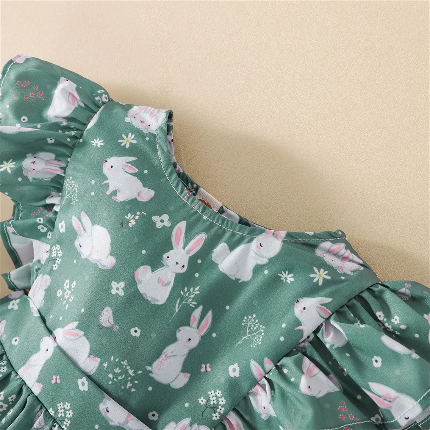 Rabbit Print Flying Sleeve Dress Style Bodysuit for Baby Girls - Easter Romper Clothing
