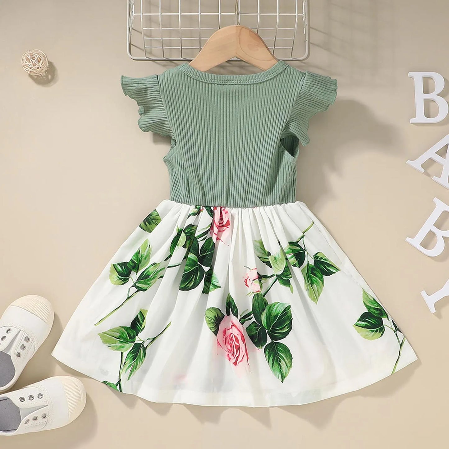 Ribbed Floral Toddler Baby Girls Summer Dress - Fly Sleeve Bow Party Princess Dress