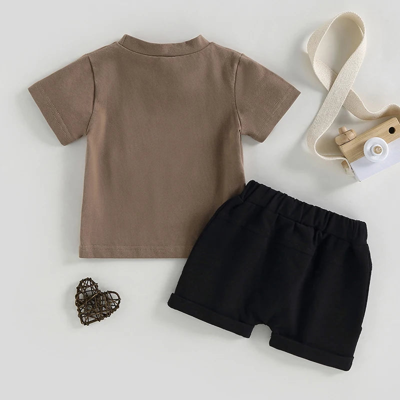 Crafted from soft and breathable fabrics, this set ensures your toddler boy stays comfortable and stylish during warm weather. The short sleeve design of the top provides added ventilation, while the pocket shorts offer convenience and a trendy touch.