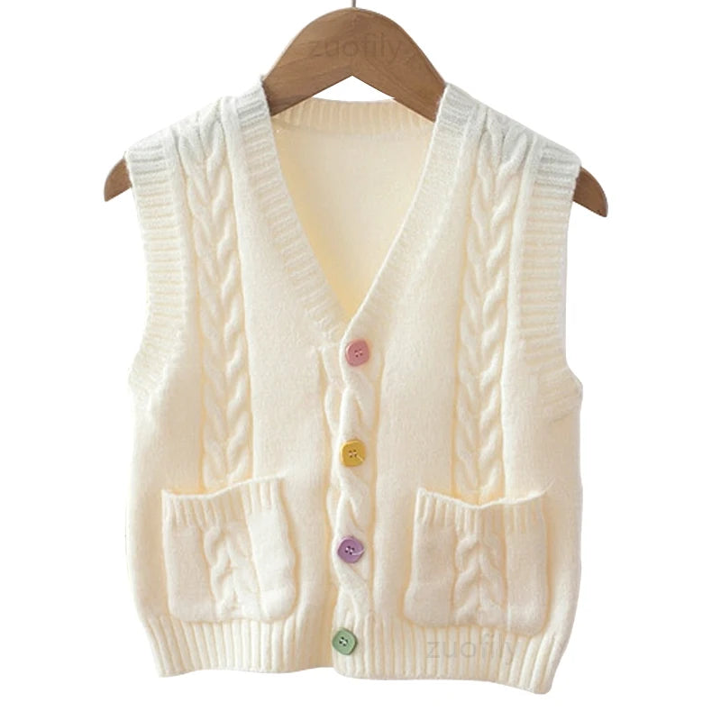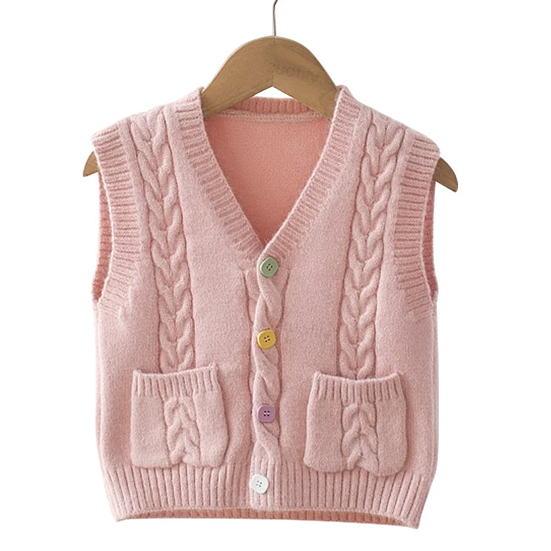 The classic cardigan coat style adds a touch of elegance, while the sleeveless silhouette ensures freedom of movement for active little ones. Whether she's playing in the park or attending a special occasion, this sweater vest is sure to keep her cozy and stylish all day long.