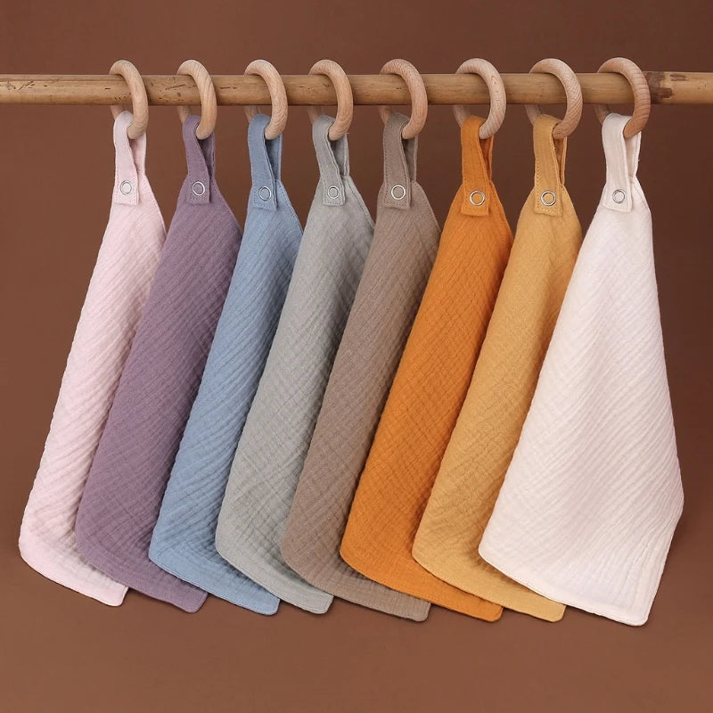 Introducing our soft cotton baby bibs with a wood teether ring, designed to provide comfort and functionality for your little one. Crafted from high-quality cotton fabric, these bibs are gentle on your baby's delicate skin. The solid color design adds a classic touch, making them versatile for everyday use.