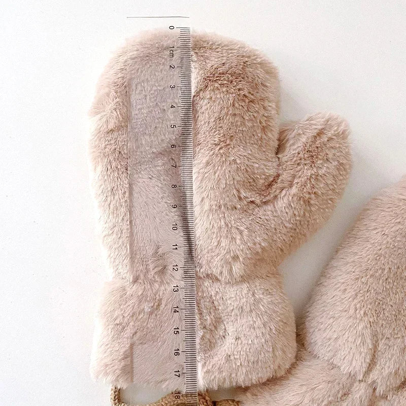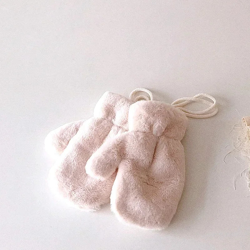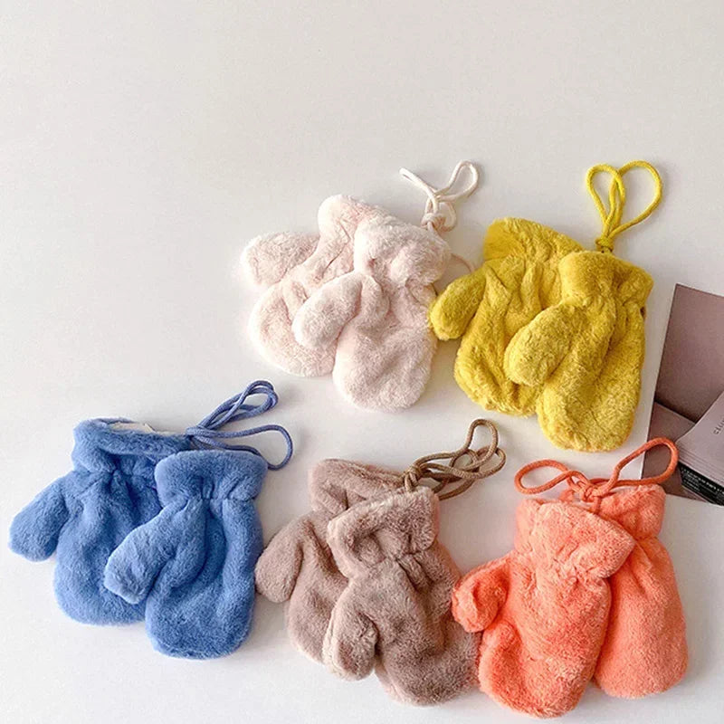 Solid Thicken Winter Warm Gloves for Kids (3-8 Years) - Soft Plush Fur Mittens with Rope