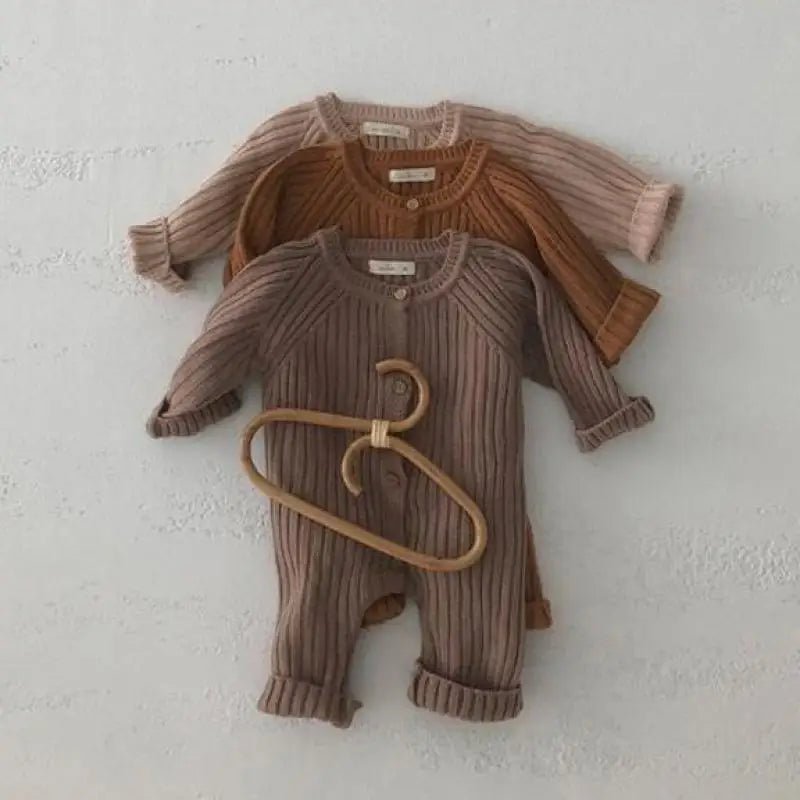 Crafted from soft and cozy knitted fabric, this romper features long sleeves to keep your baby warm on cooler days. The solid color design adds a touch of simplicity and versatility to the outfit, making it easy to pair with other clothing pieces.