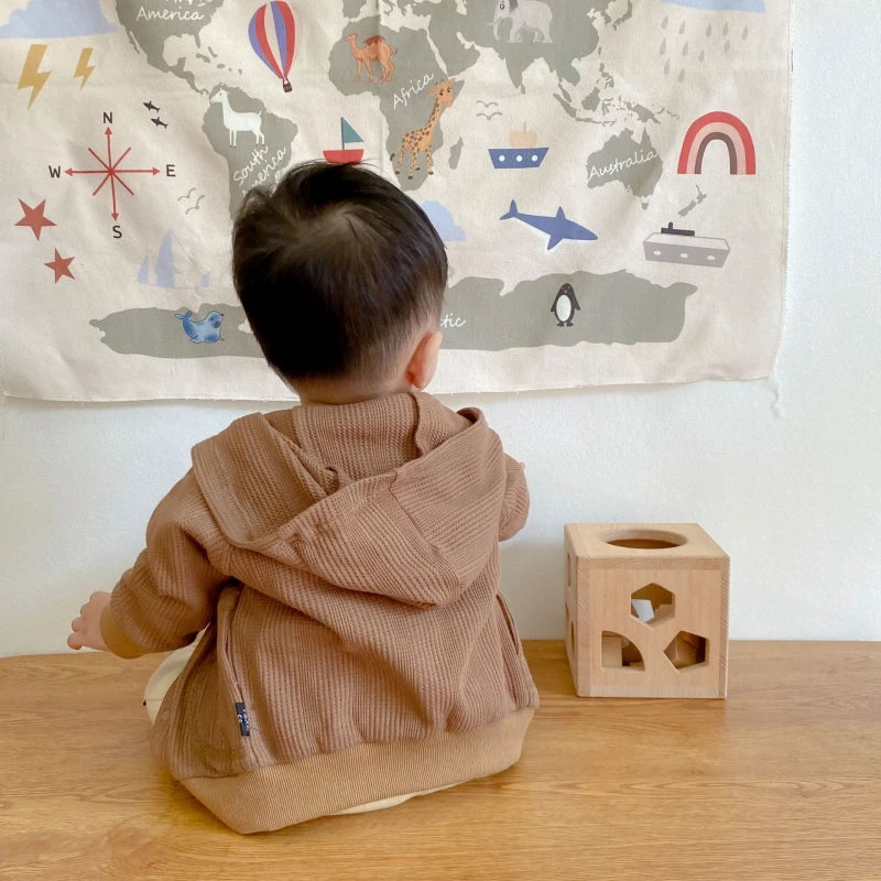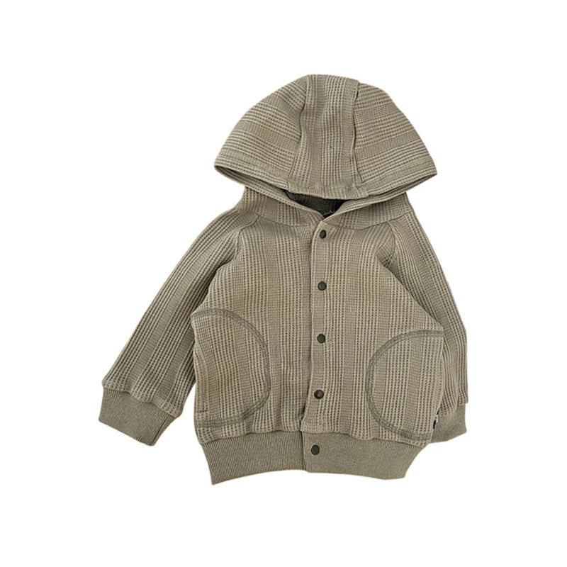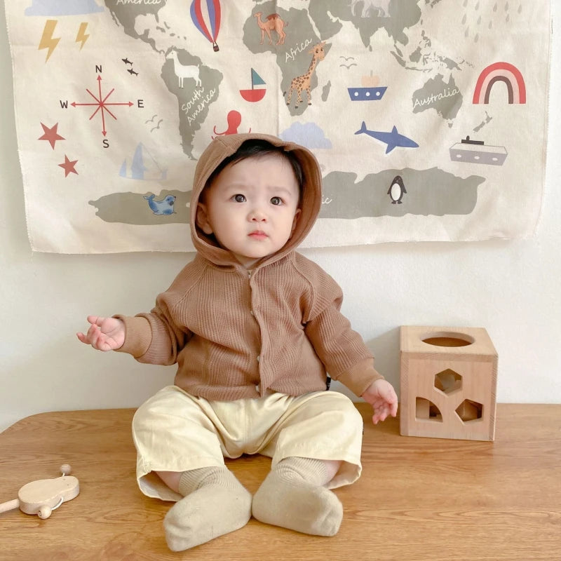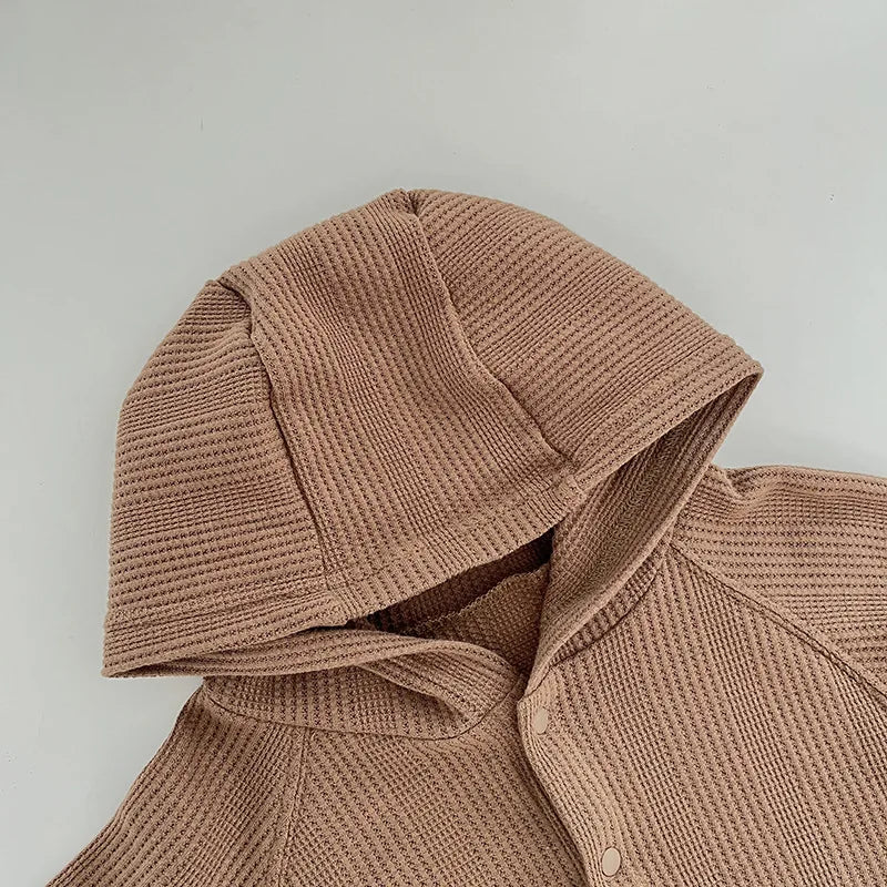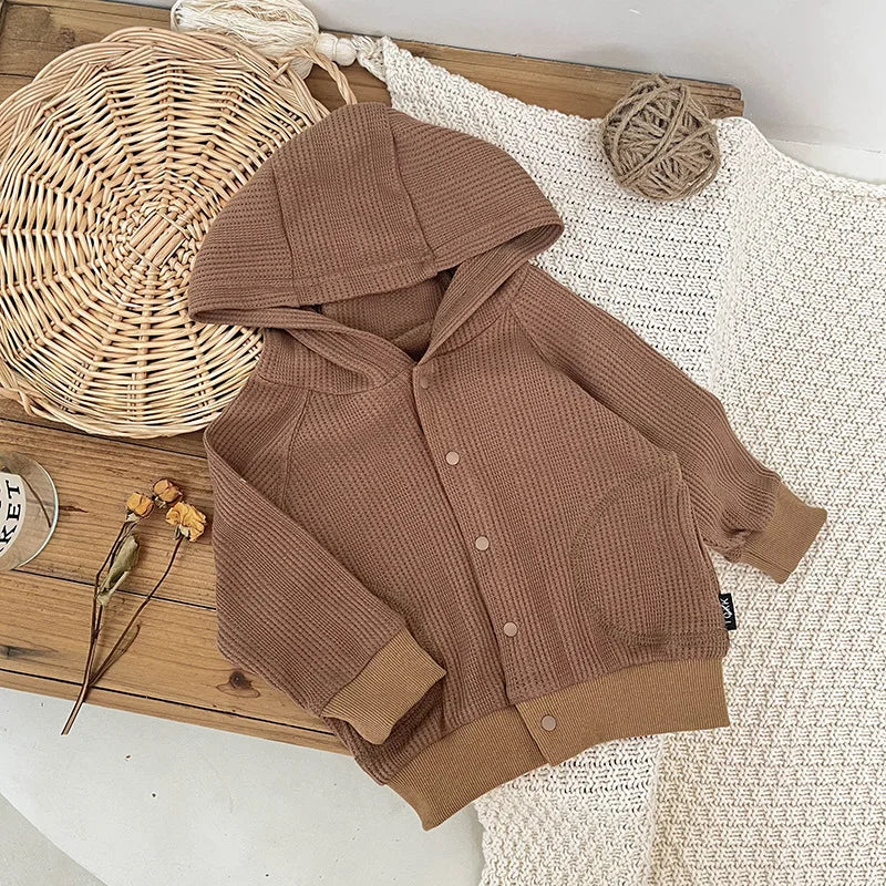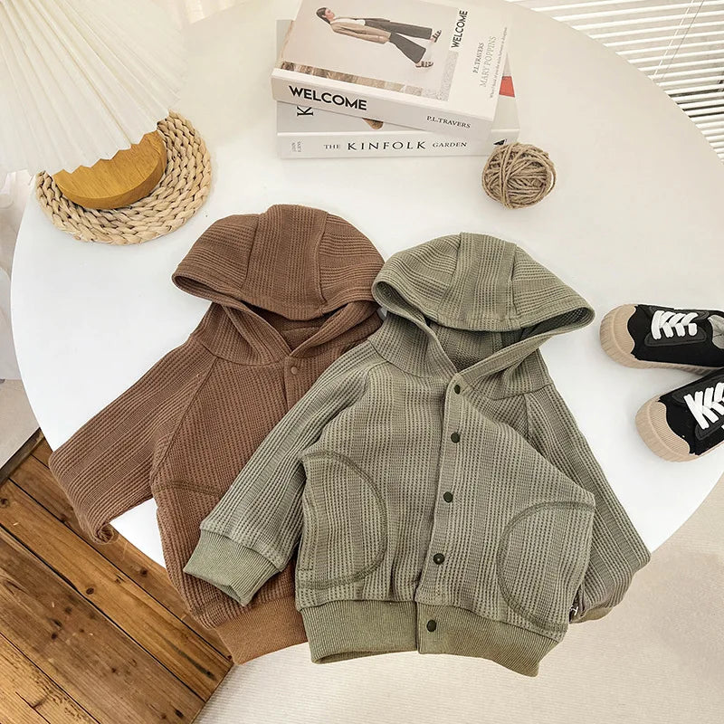 Elevate your little one's autumn wardrobe with our Spring Toddler Boy's Cotton Waffle Hooded Jacket. Crafted with exquisite attention to detail, this jacket showcases the beautiful texture of its fabric, adding an elegant and fashionable touch to any outfit.