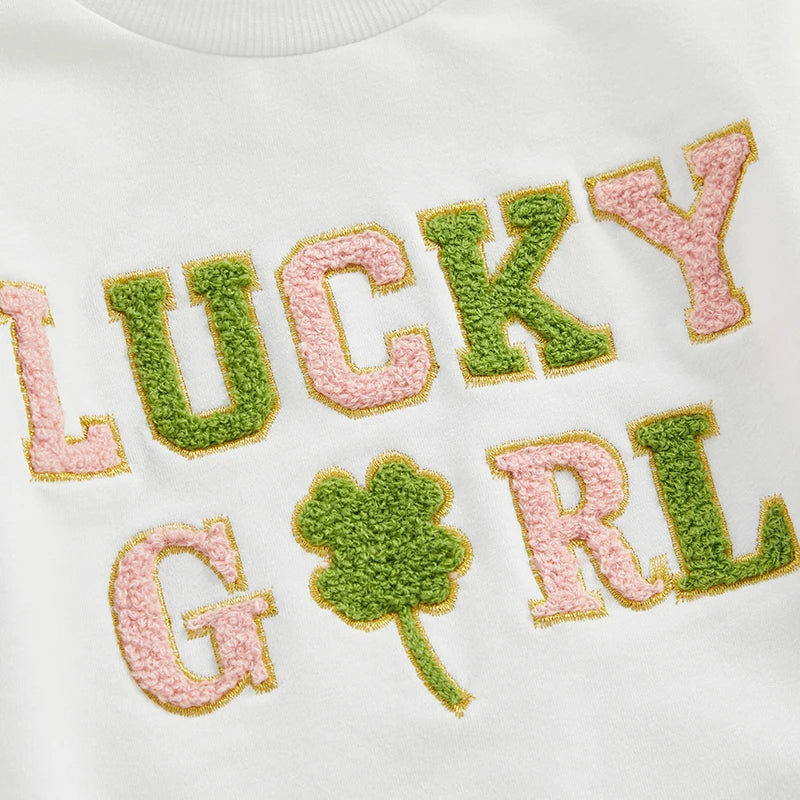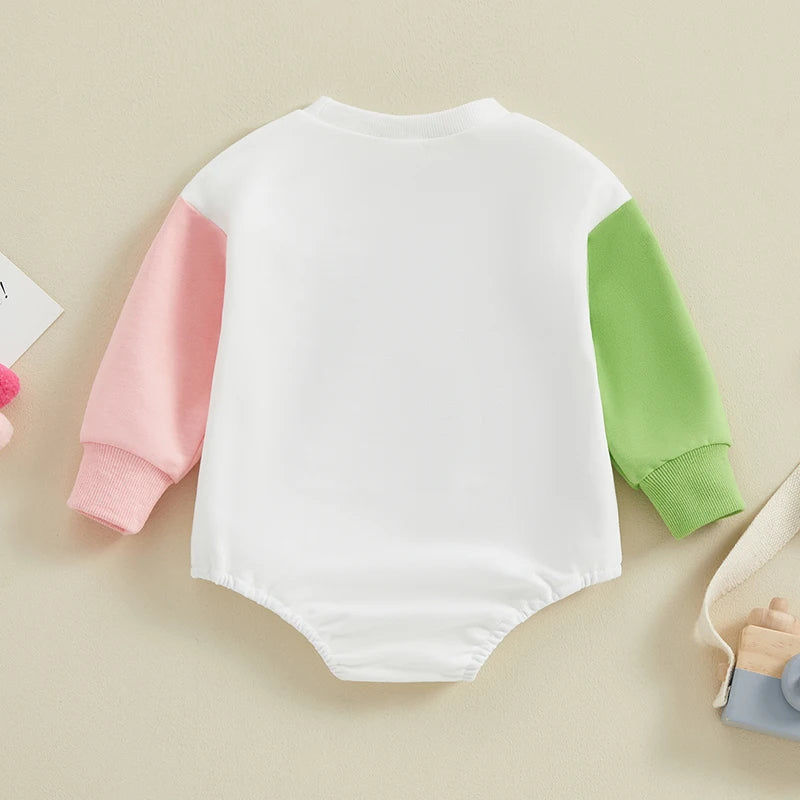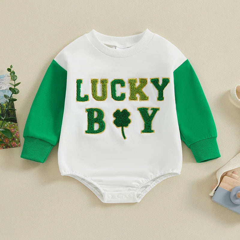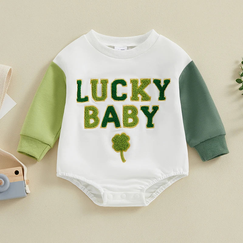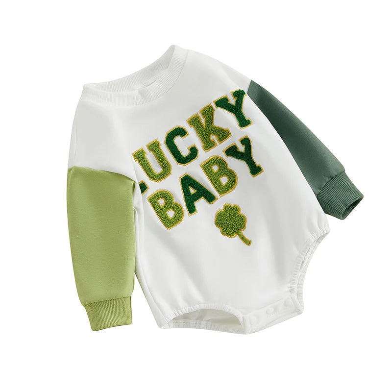 Get your little one ready for St. Patrick's Day festivities with our charming Baby Romper. This adorable jumpsuit features long sleeves, a cozy crew neck, and intricate embroidery letters with shamrock designs, adding a touch of Irish charm to your baby's outfit.