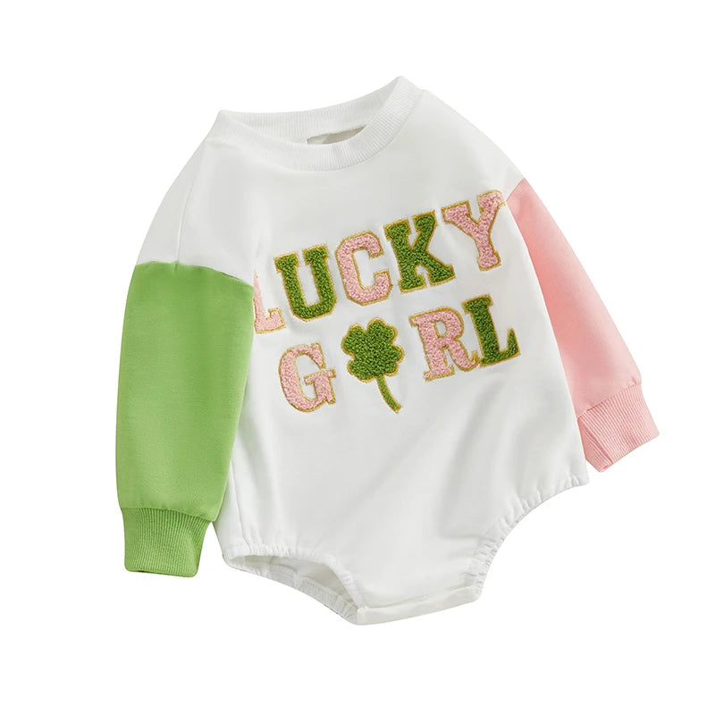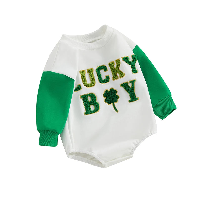 St. Patrick's Day Baby Romper - Long Sleeve Crew Neck Embroidery Letters Shamrock Jumpsuit