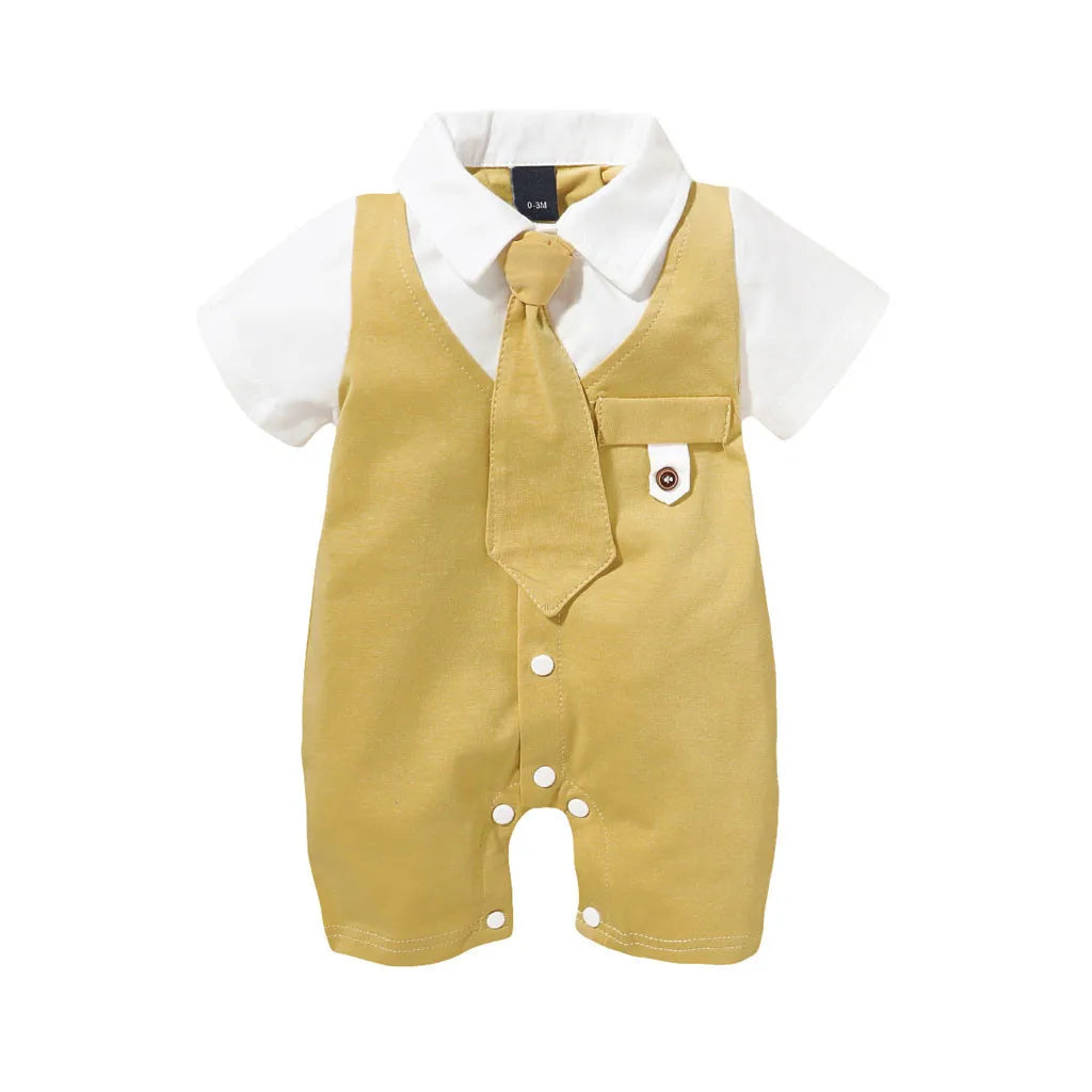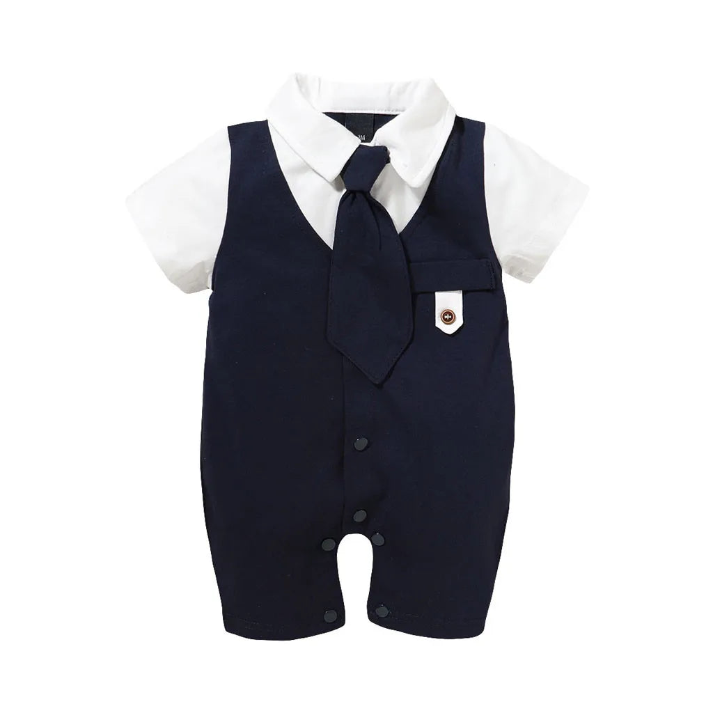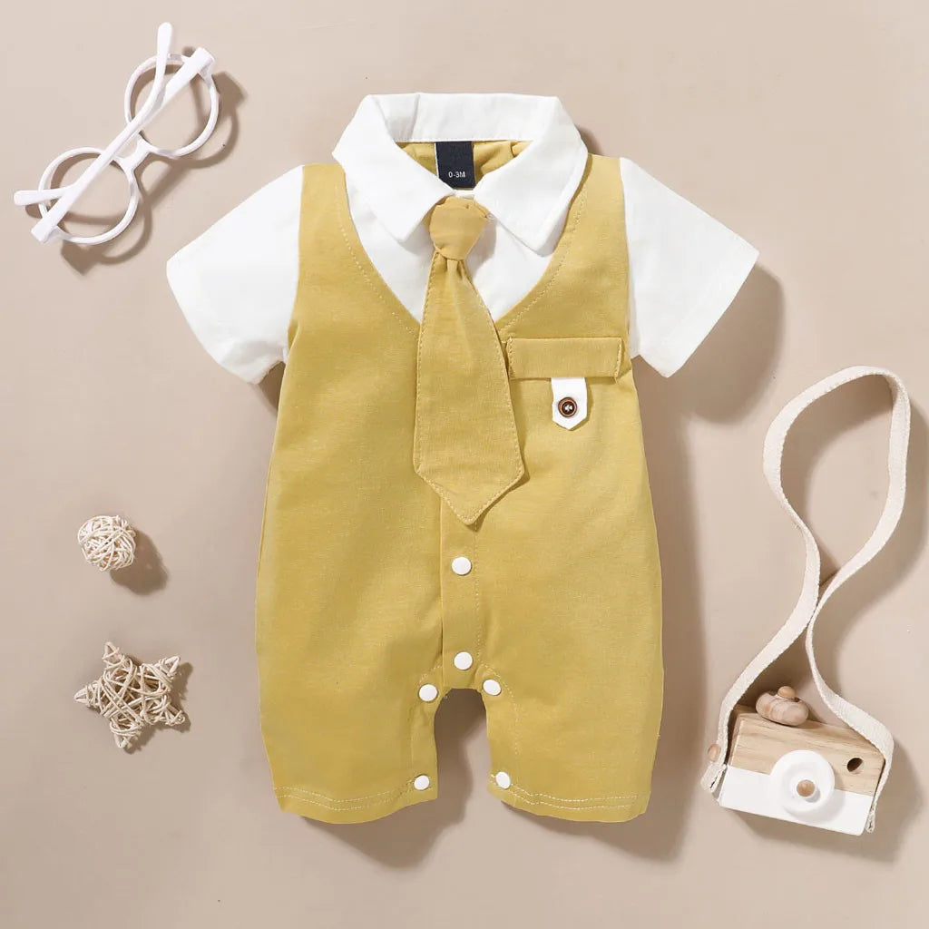Summer Baby Boys Gentleman Romper with Tie: Short Sleeve Jumpsuit Infant Outfit