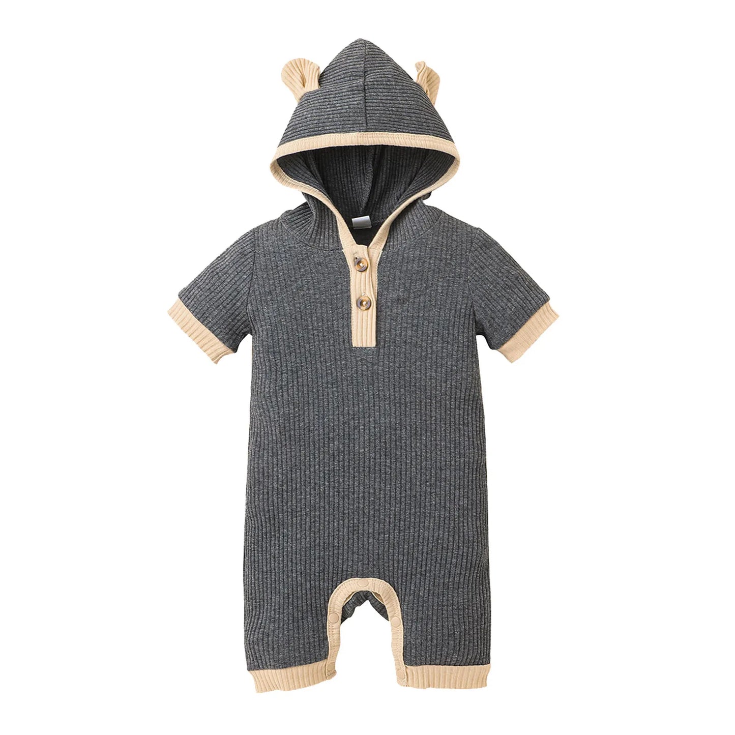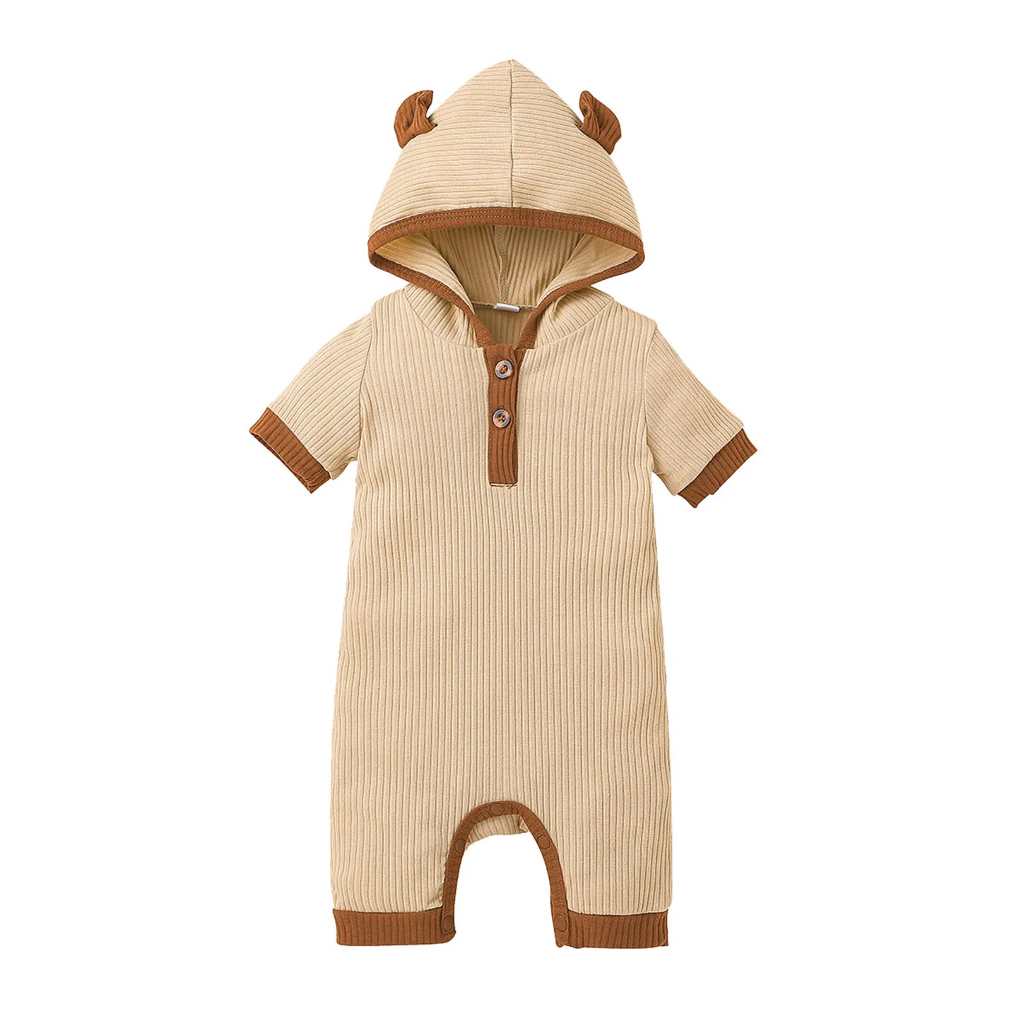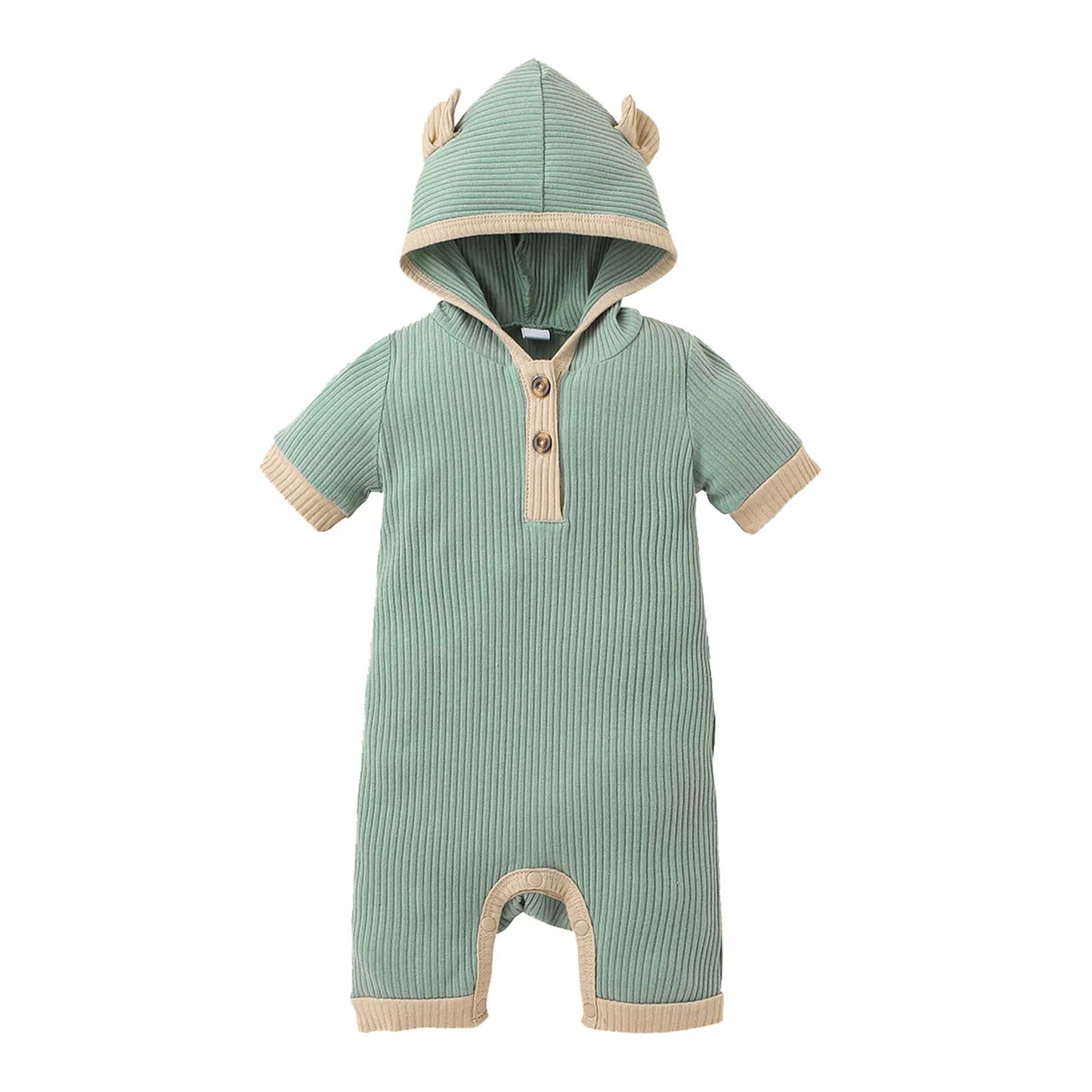 Crafted from soft and breathable cotton fabric, this romper features a hooded design and short sleeves, making it ideal for warmer days. Its solid color adds a touch of simplicity and versatility to your baby's wardrobe.