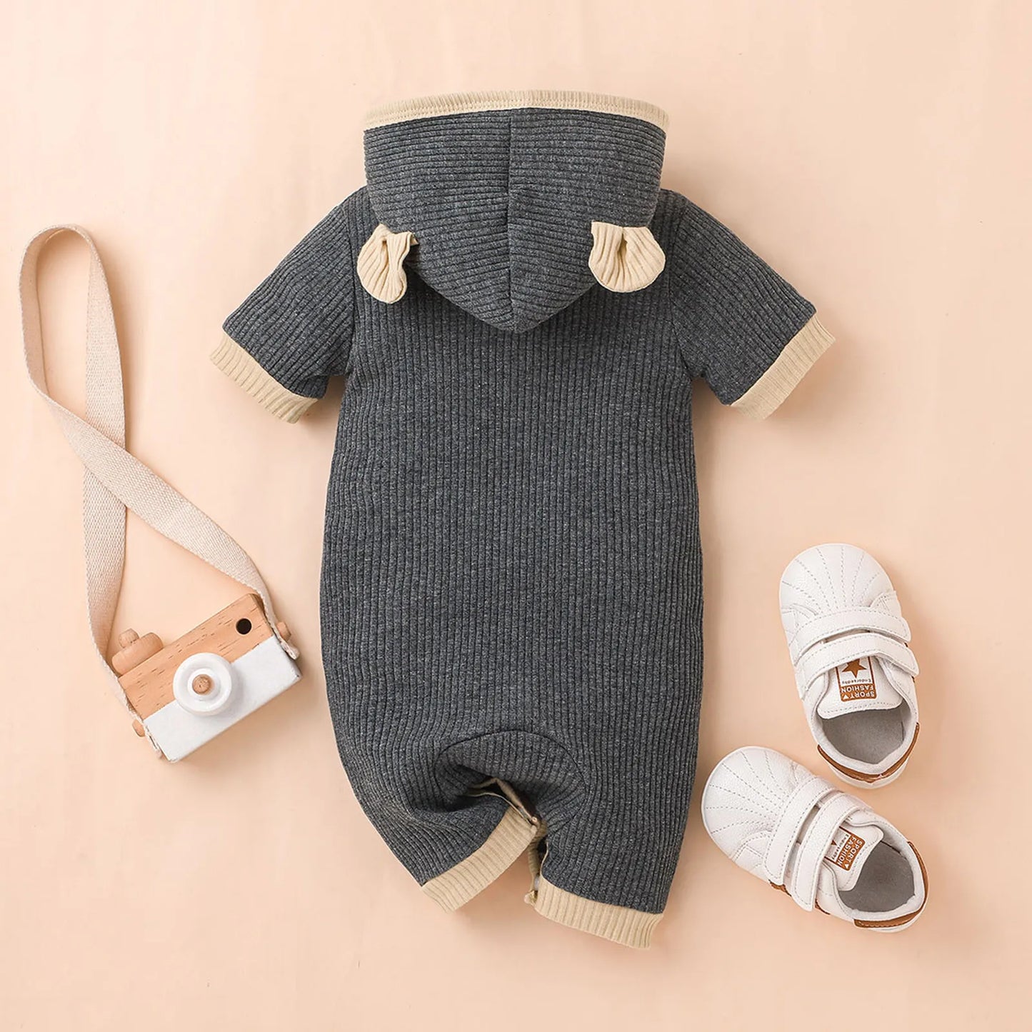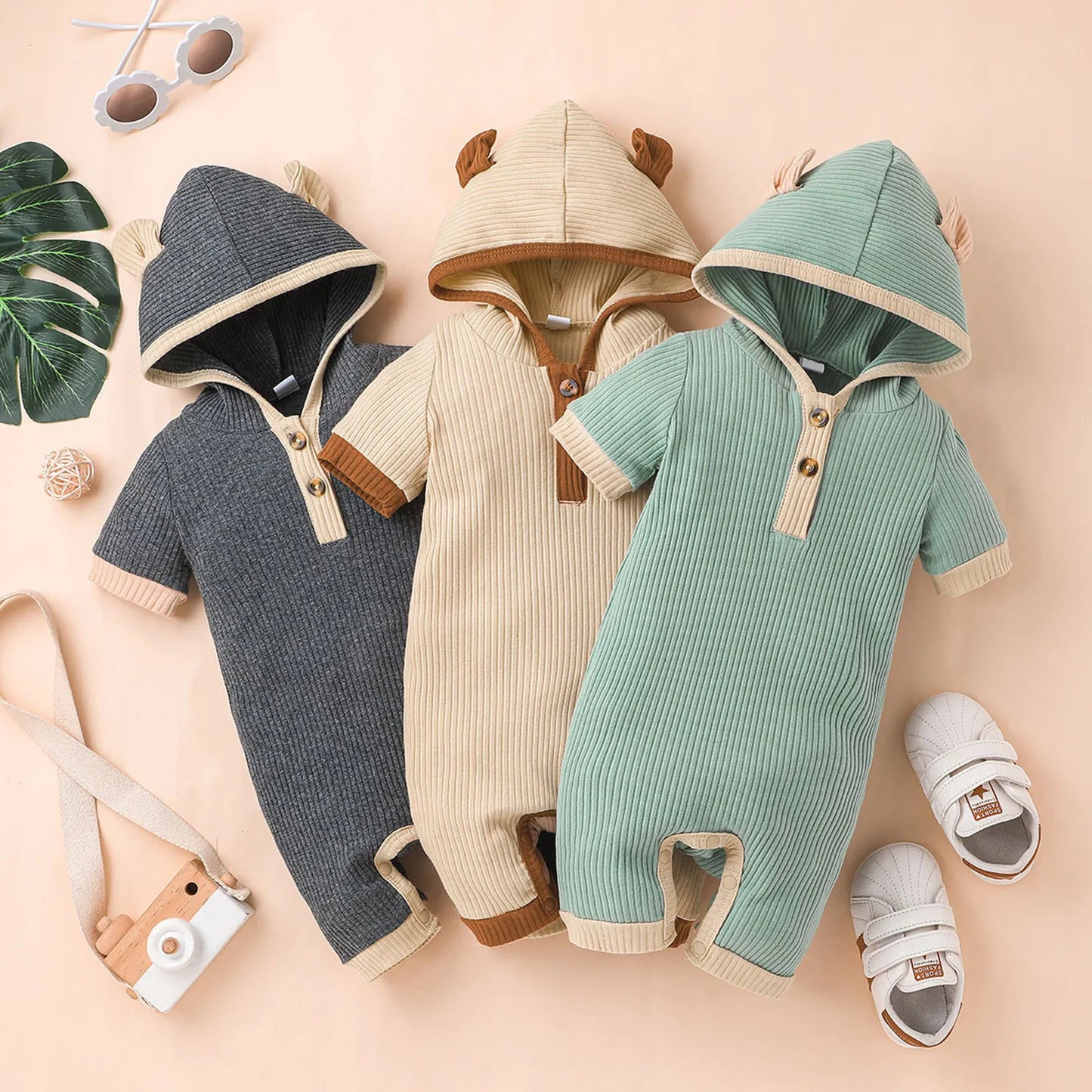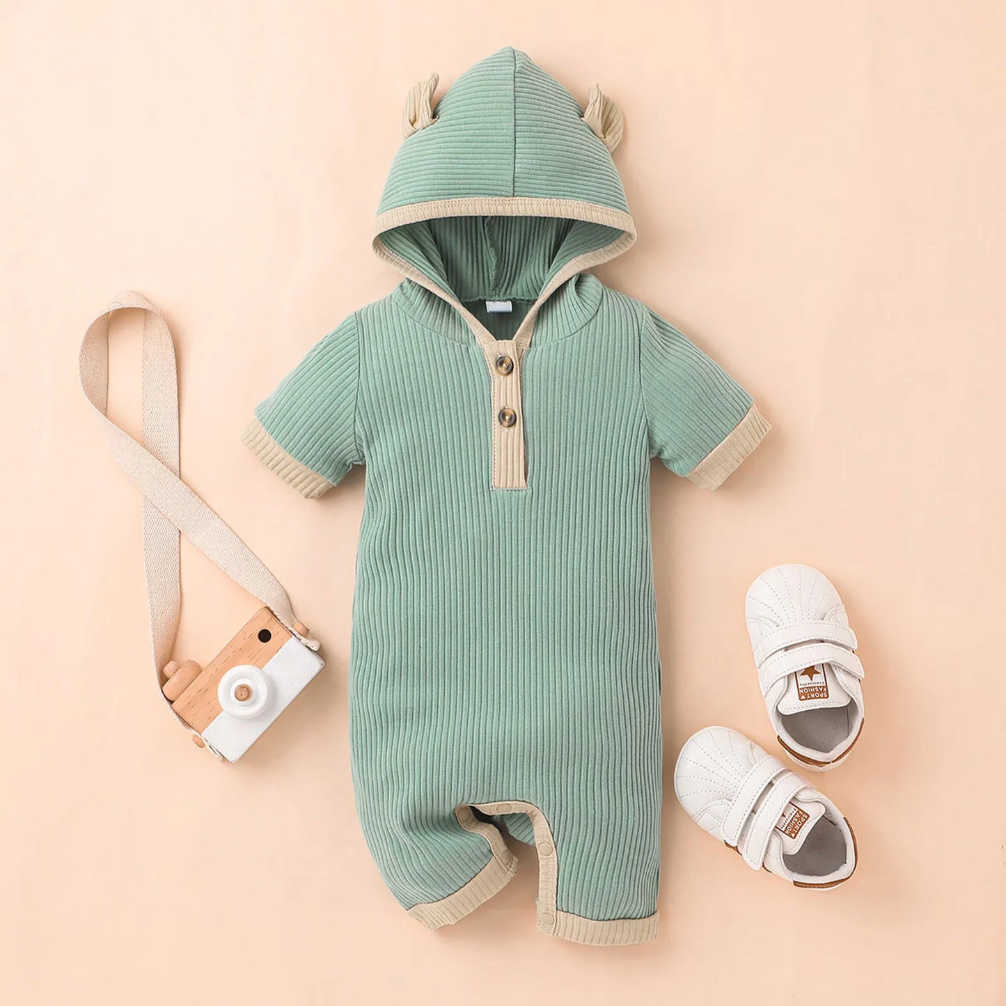Crafted from soft and breathable cotton fabric, this romper features a hooded design and short sleeves, making it ideal for warmer days. Its solid color adds a touch of simplicity and versatility to your baby's wardrobe.