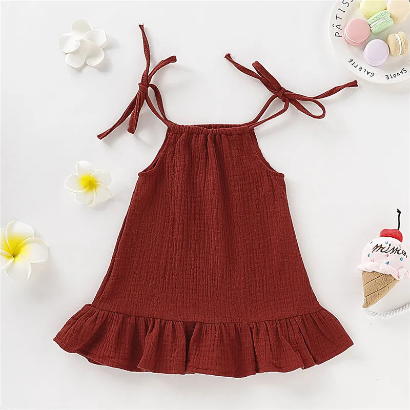 Summer Breathable Cotton Slip Dress for Kid Girls - Adjustable Solid Color Halter Dress for Toddler Girl Beachwear