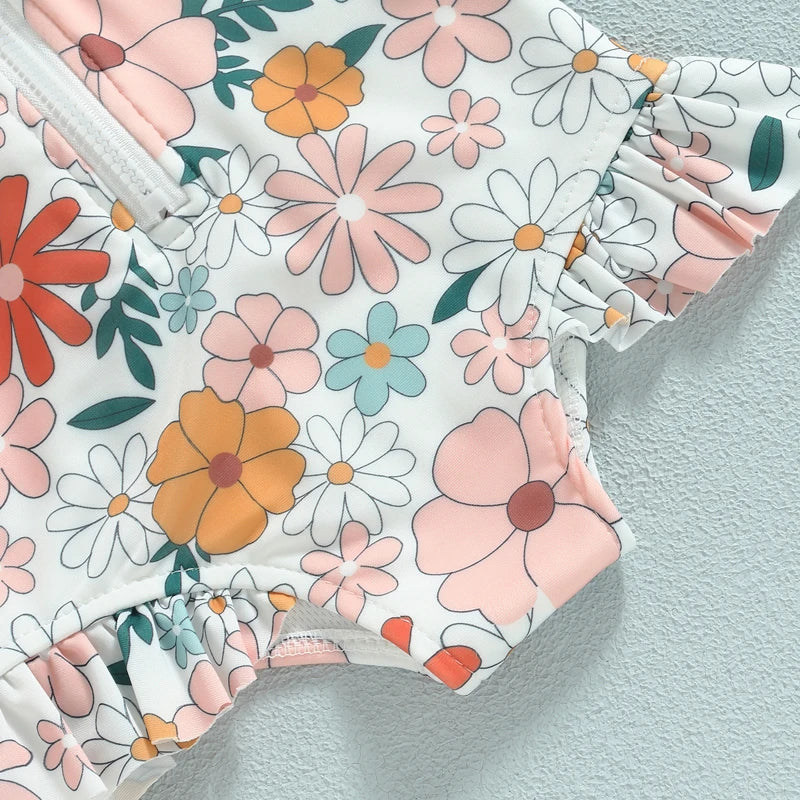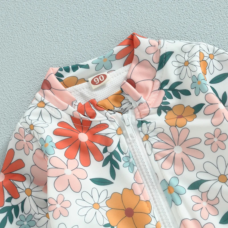 Summer Girl Floral Swimsuit - Long Sleeve Zipper Ruffles Jumpsuit Beachwear Bathing Suit