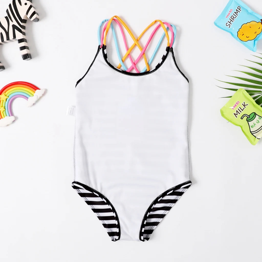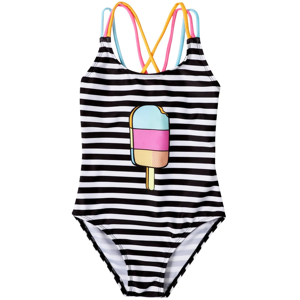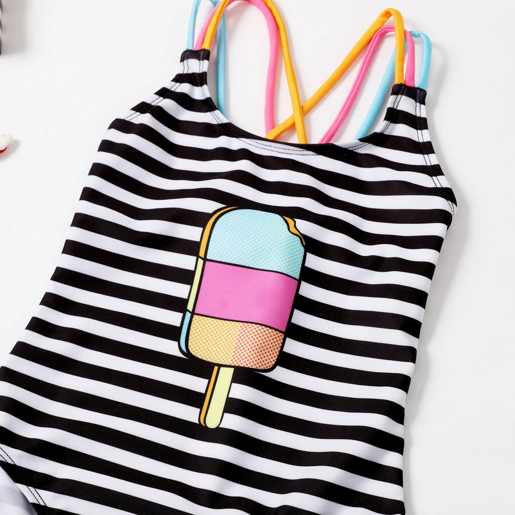 Summer Kids Baby Girls Swimwear Bodysuit with Ice Cream Striped Print, Sleeveless
