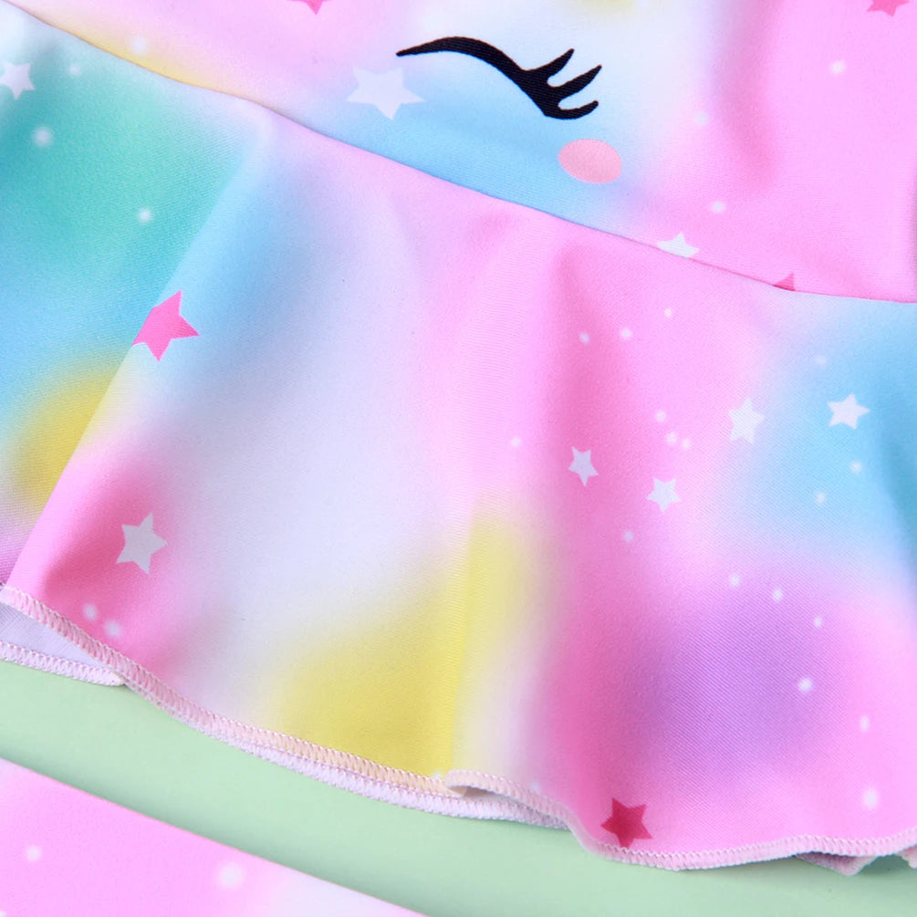 Make a splash with this adorable girl's two-piece swimsuit! Featuring a charming unicorn pattern, the ruffle hem fly sleeve tops add a touch of whimsy to her beach ensemble, while the matching swimming shorts complete the look with ease. Perfect for fun-filled days at the pool or beach, this swimsuit is sure to become a favorite.