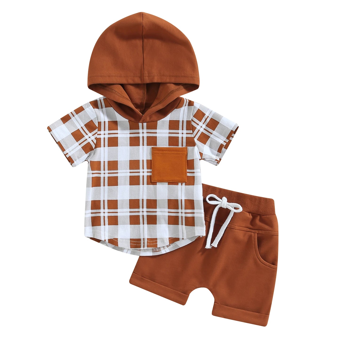 Toddler Baby Boy 2-Piece Summer Clothes: Short Sleeve Hooded Plaid Print Loose Shirt, Drawstring Pants