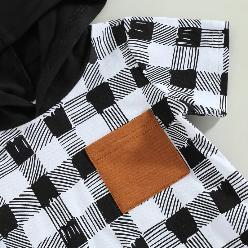 Crafted from lightweight and breathable fabrics, the short sleeve shirt offers a relaxed fit with its hooded design and stylish plaid print. The drawstring pants provide comfort and adjustability, ensuring a snug fit for your active toddler.