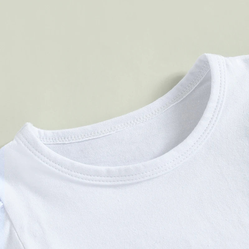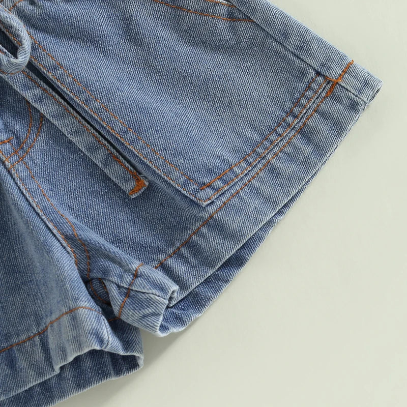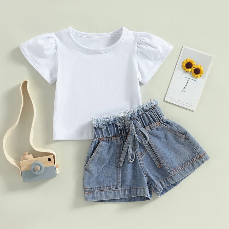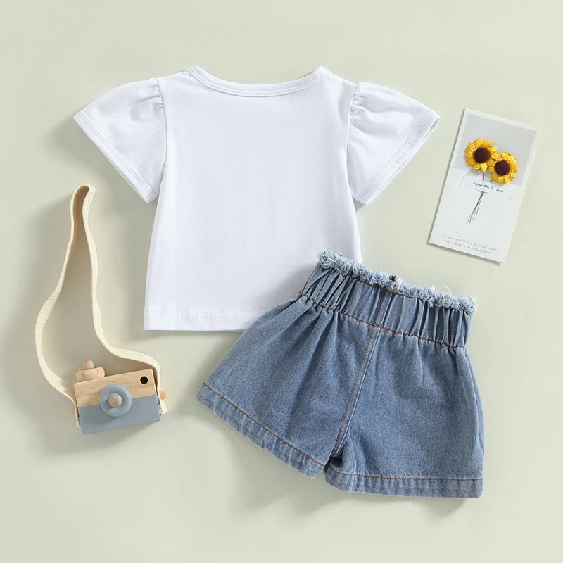 Crafted from soft and durable materials, this outfit ensures your toddler stays comfortable and stylish throughout the day. The elastic bandage design on the denim shorts provides a secure and adjustable fit, while the short sleeves of the t-shirt offer freedom of movement. Whether it's a day at the park or a backyard barbecue, your little one will look effortlessly cute in this versatile set.
