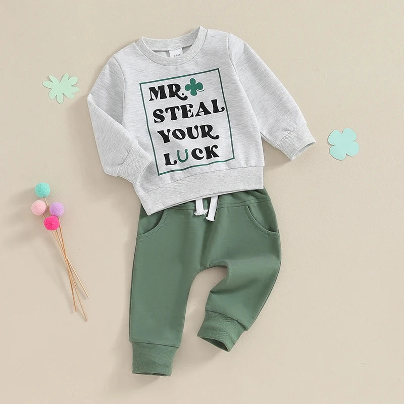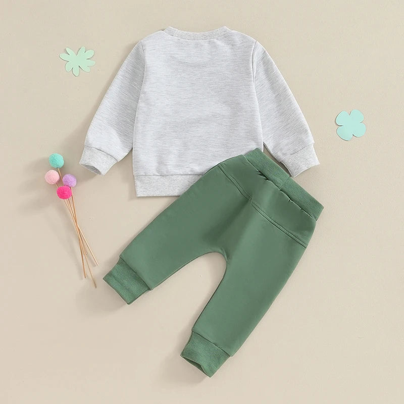Dress your little boy in festive style with our Toddler Baby Boy St. Patrick's Day Outfit. This charming set includes a clover letter sweatshirt and t-shirt tops paired with pants, perfect for celebrating the holiday in comfort and style during the spring season.