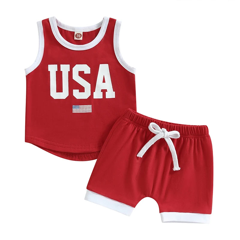 Crafted from lightweight and breathable fabrics, the sleeveless vest adds a patriotic touch with its USA letter print design. The red drawstring shorts offer comfort and adjustability, ideal for active toddlers.