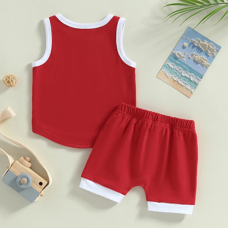 Toddler Boy 2-Piece Summer Outfit Sets: Sleeveless O-Neck USA Letter Print Vest, Red Drawstring Shorts