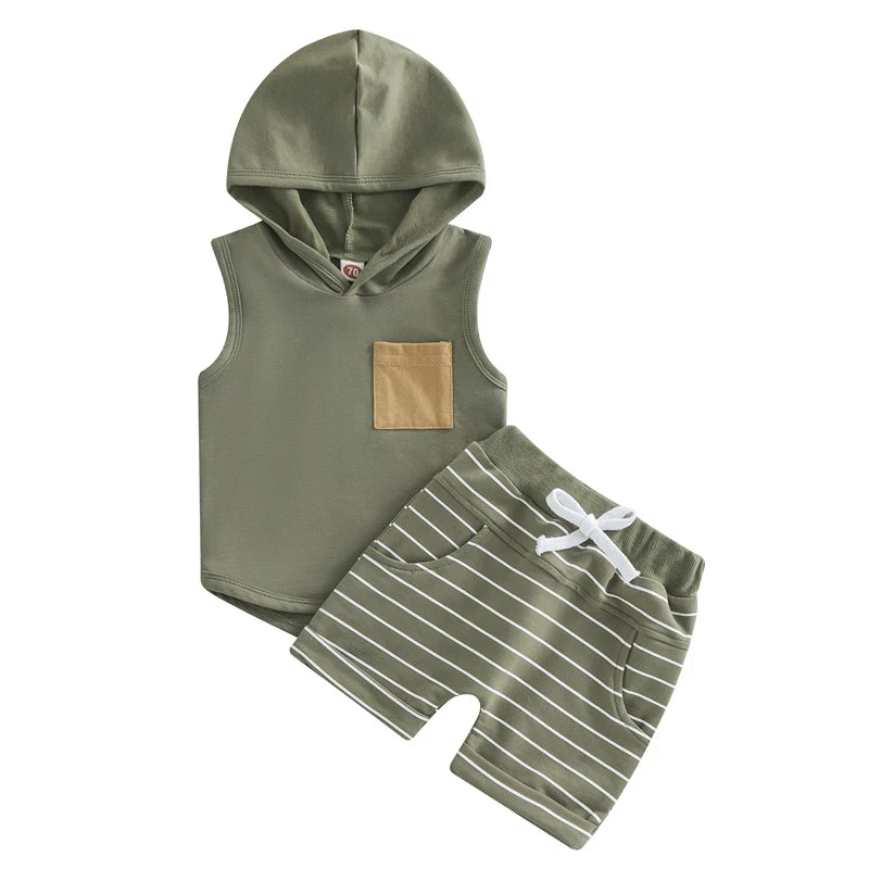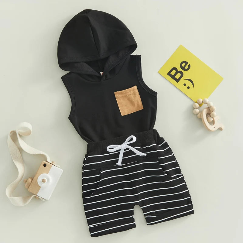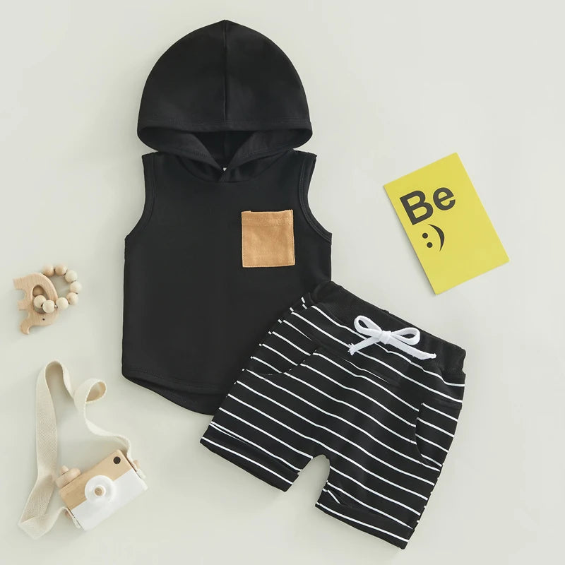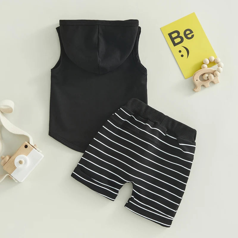 Toddler Boys Summer 2-Piece Outfit Sets: Sleeveless Hooded Tank Tops and Striped Drawstring Shorts