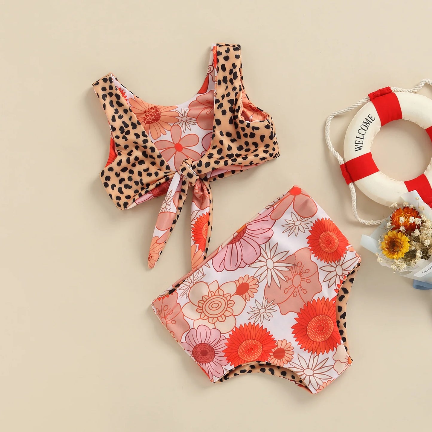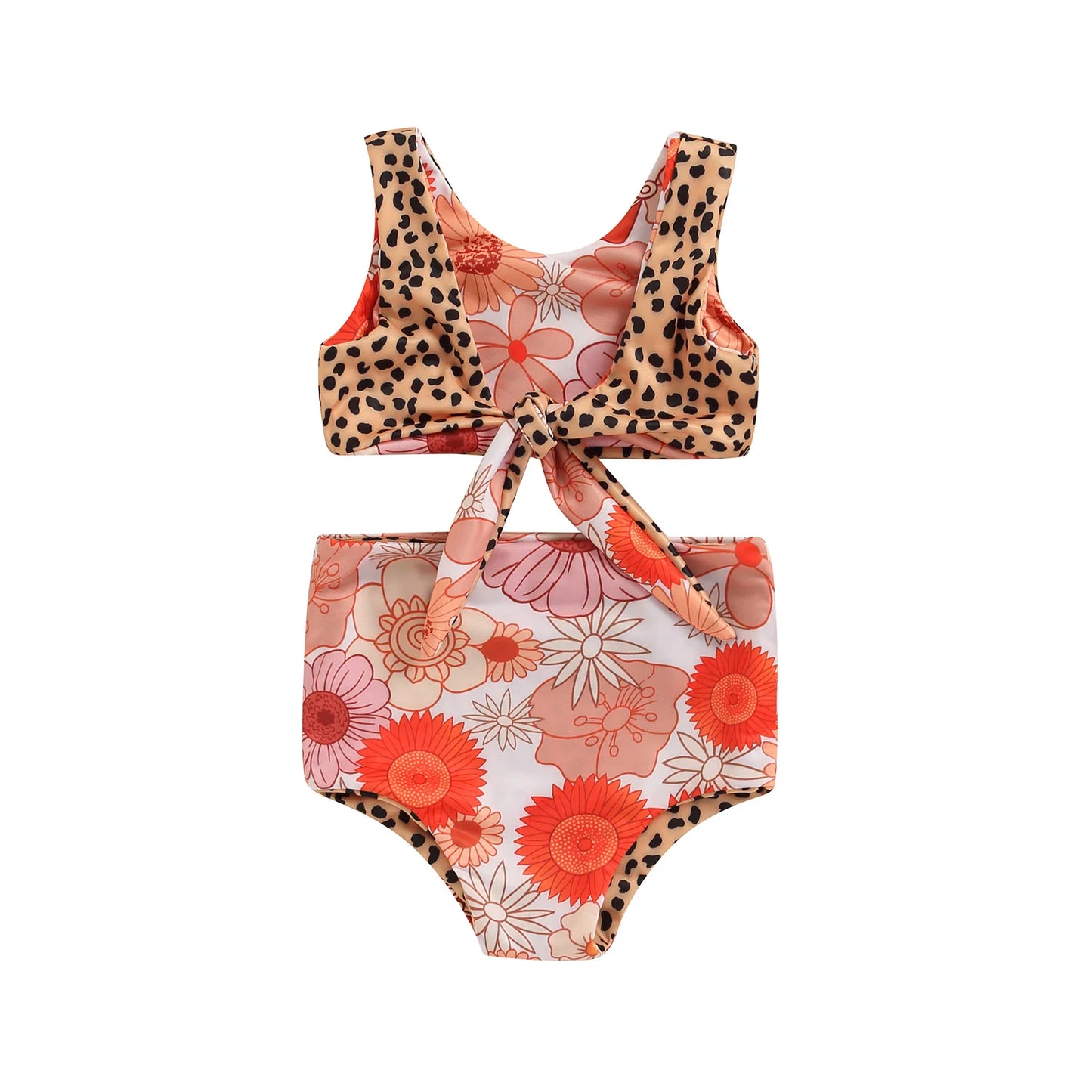 Crafted with comfort and style in mind, these swimwear sets are made from lightweight and quick-drying materials, ensuring your little one stays cool and comfortable all day long. The sleeveless backless knotted vest adds a trendy touch to her beach ensemble, while the leopard or floral print bottoms offer a fun and playful vibe.