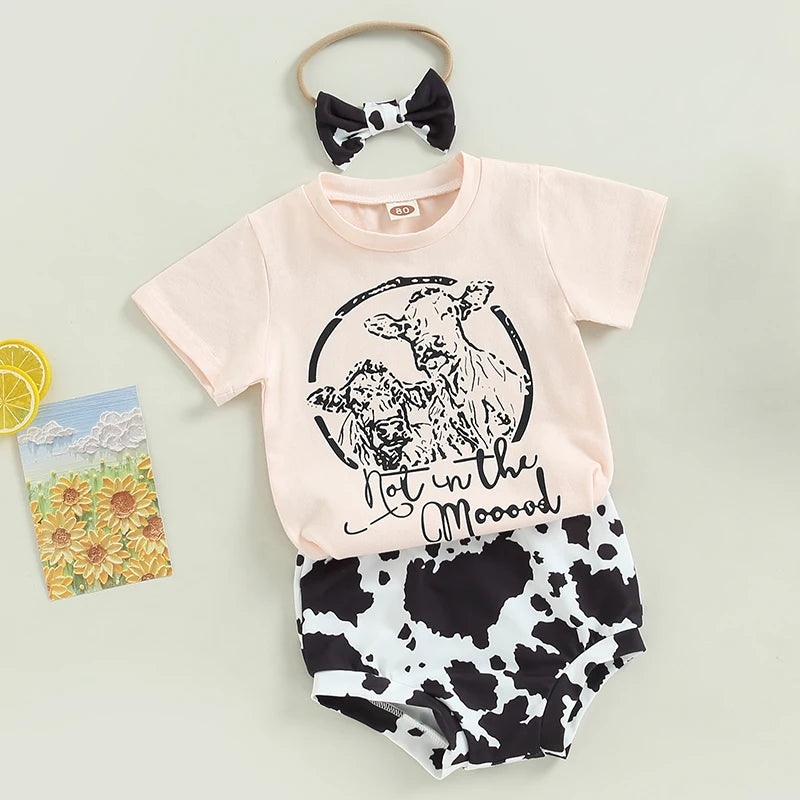 Dress your little girl in adorable style with our 0-24M Toddler Girls Clothes Set. This ensemble includes short sleeve round collar bull print tops, short pants, and a coordinating headband, perfect for any occasion.